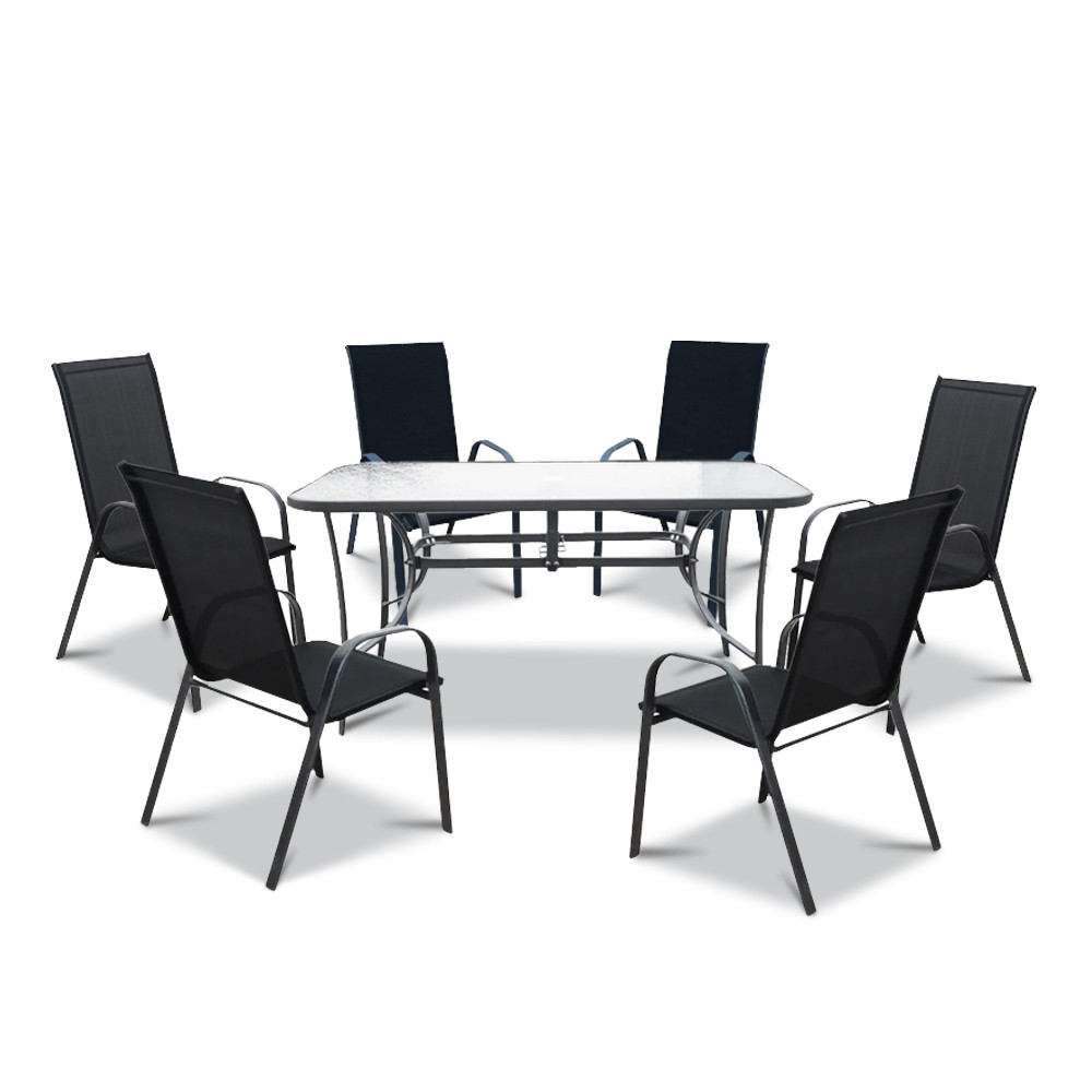 A modern kivitelű kerti bútorkészlet egy kerti üveglapos asztalt és 6 széket tartalmaz. A bútorokat 6 fő számára tervezték. A székek teherbírása 120 kg. A székek és az asztal lábazata fémből készül. Az asztallap 5 mm-es edzett üvegből készült, amely ellenáll a kisebb karcolásoknak. Az textilén szék ülésanyaga ellenáll az időjárási viszonyoknak. Előnye az ergonómikusan profilált ülés és karfa, amelyek tehermentesítik a vállakat pihenés közben.