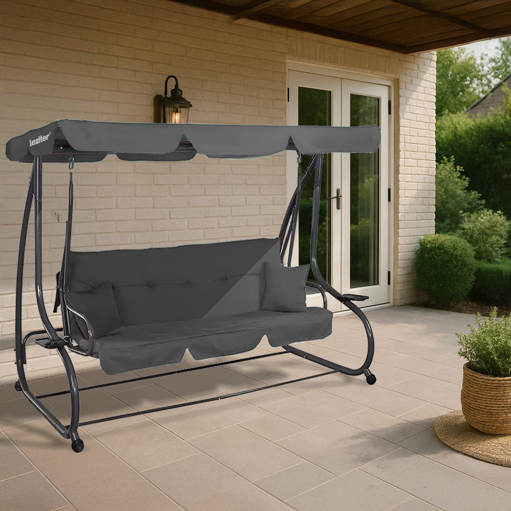 Ez a prémium minőségű, háromszemélyes hintaágy ideális választás minden kertbe vagy teraszra! 200x110x165 cm-es mérete bőséges helyet biztosít akár három ember számára, miközben stabil kialakításának köszönhetően masszív és biztonságos.