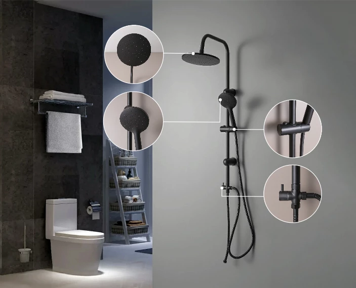 A Corina Black zuhanyszett stílusos és modern megjelenésű. Az ABS kézi zuhanyfej és esőztető minőségi anyagból készült, melynek köszönhetően sokáig élvezheti használatát. A zuhanyszett teste rozsdamentes acélból készül, kézi zuhany magassága állítható.