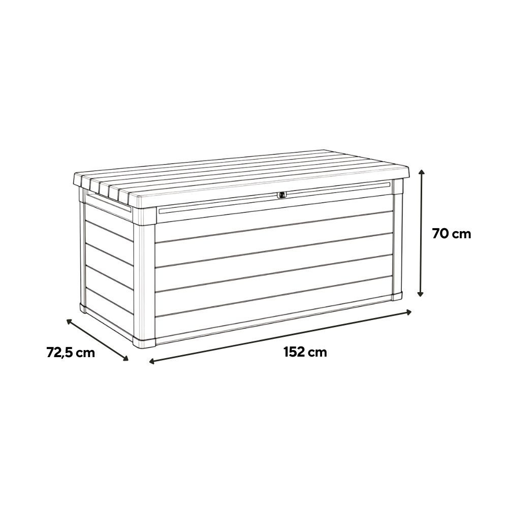 A stabil szerkezet és az arányos kialakítás lehetővé teszi, hogy a kerti láda nagyobb teraszon, kertben vagy akár fedett kültéri részen is jól elhelyezhető legyen. A zárható fedél segít a tárolt eszközök biztonságos tárolásában, miközben a nagy kapacitás hozzájárul a rendezett, átlátható kültéri környezet kialakításához.