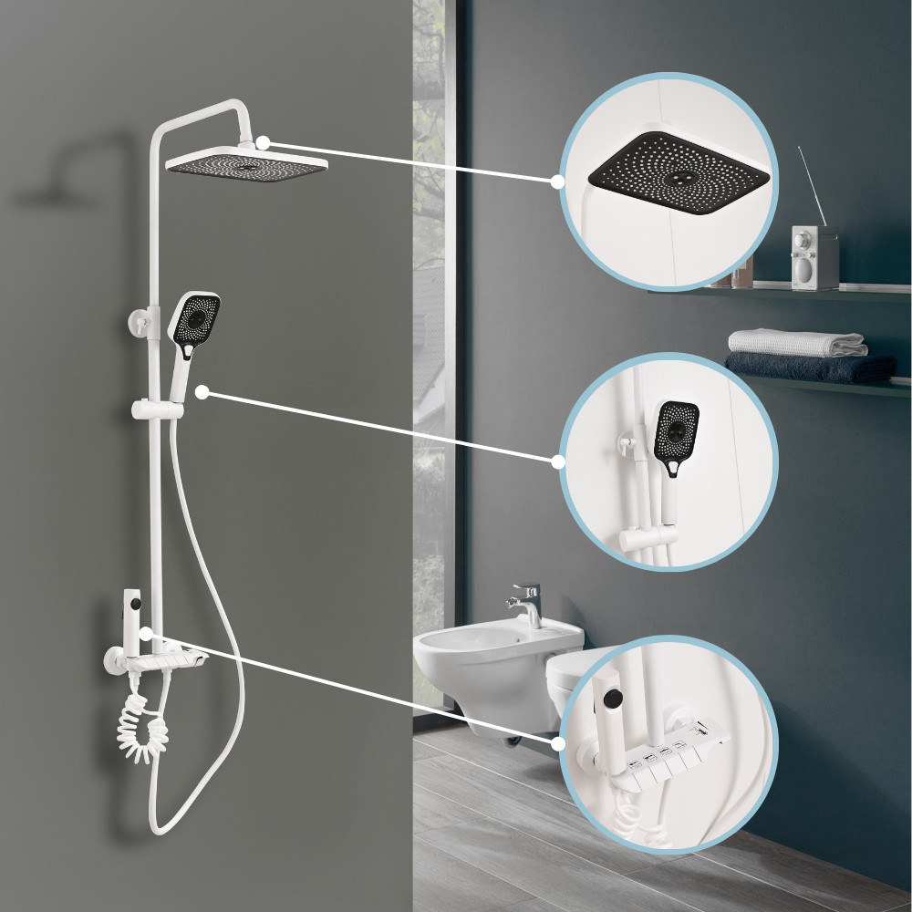 Az Eliz multifunkciós zuhanyszett a Leziter prémium kategóriájú modellje, amely a design, a funkcionalitás és a kényelem tökéletes egyensúlyát kínálja. A modern fehér árnyalat és a letisztult formák elegáns megjelenést kölcsönöznek bármilyen fürdőszobának, miközben a sokoldalú funkciók gondoskodnak a személyre szabott zuhanyélményről.