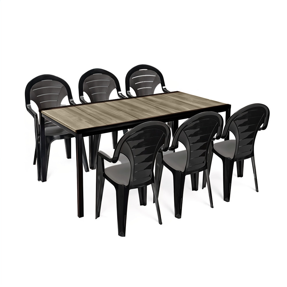 Egyetlen, nagyméretű szettben mindent megkapsz, ami a hétköznapi reggelitől a baráti grillpartiig kell: hat Bonaire rakásolható karfás szék + egy 200 × 95 cm-es Porto étkezőasztal – prémium műanyagból, kompromisszumok nélküli kényelemmel és nulla karbantartással.
