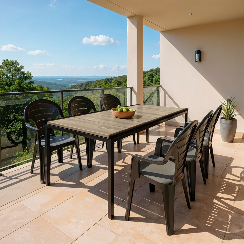 A meleg kőris tónusú asztallap és a letisztult grafit székek elegáns, kortárs megjelenést adnak. Legyen a teraszod skandináv, mediterrán vagy ipari hangulatú, a Lagos Large kifinomult középponttá válik.