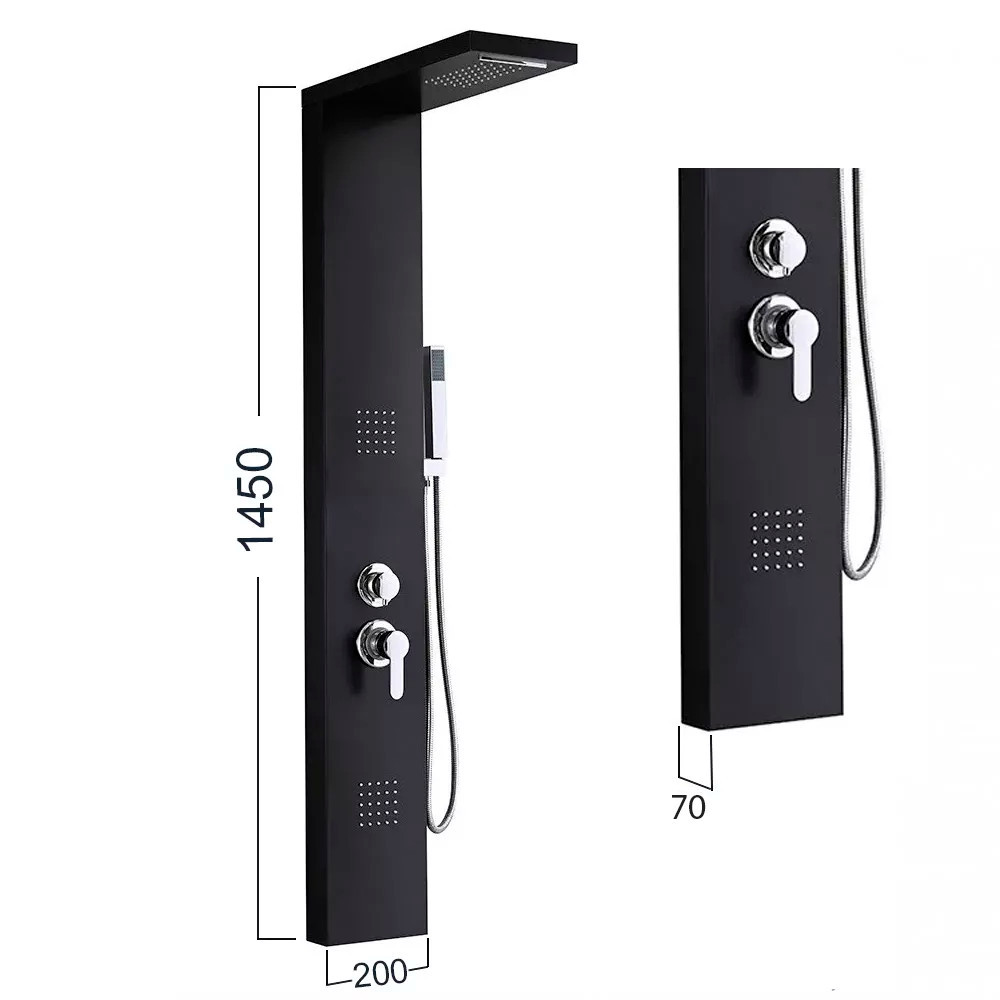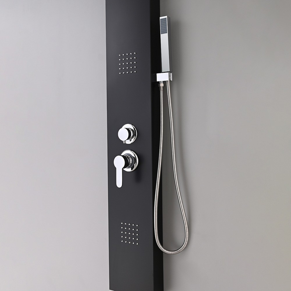 A Malaga Black hidromasszázs zuhanypanel egy lenyűgöző és modern megoldás a fürdőszobákban, amely luxus-élményt nyújt zuhanyzás közben. Ezt a zuhanypanelt kifejezetten a kényelemre és relaxációra tervezték, miközben funkciókban gazdag és stílusos kialakításával a fürdőszobai enteriőr részévé válik. A zuhanypanel mérete 145 x 20 X 7 cm. Az anyaga festett alumínium ötvözet, ami erős és tartós, miközben könnyű súlyú és hosszú távon is megőrzi esztétikus megjelenését. Ez a modern anyagválasztás garantálja a zuhanypanel hosszú élettartamát.