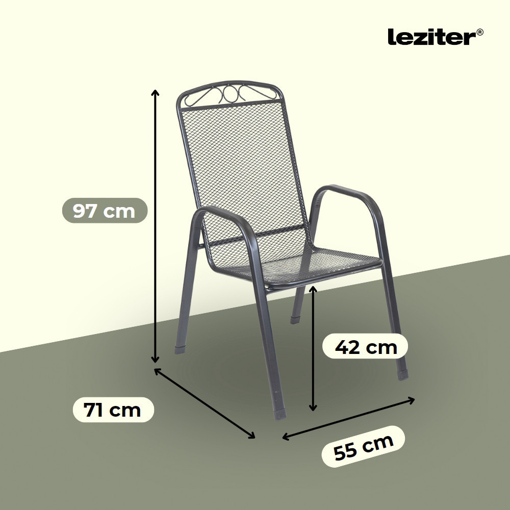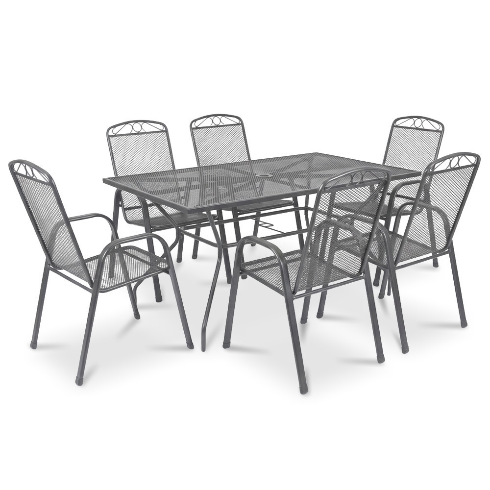 Az Alfi 6+1 kerti bútor garnitúra szett antracit színben egy nagyméretű Melfi téglalap alakú kerti asztalt és 6 db Alba összecsukható kerti széket tartalmaz, stabil acél szerkezetével, korrózióálló és porszórt felületkezelésével, valamint modern hálós kialakításával praktikus és stílusos megoldást kínál kültéri étkezésekhez kertben, teraszon vagy erkélyen.