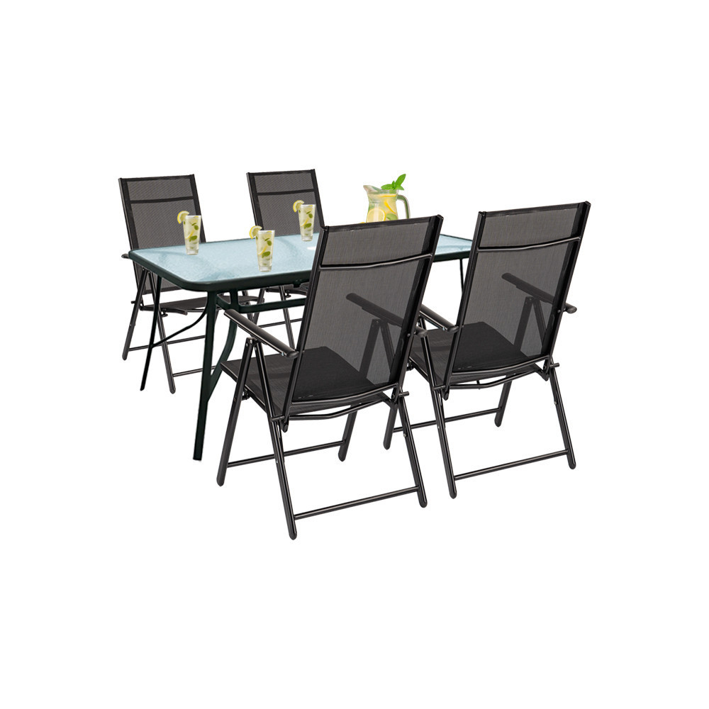 A garnitúra tartalmaz egy téglalap alakú, 150x90 cm-es üvegasztalt, valamint négy Lugo összecsukható fémvázas kerti széket, amelyek 7 különböző pozícióba állíthatók, hogy a lehető legkényelmesebb ülést biztosítsák.