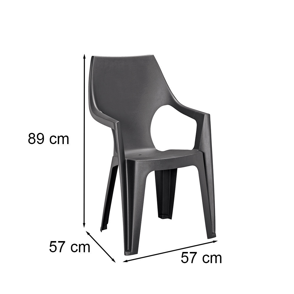 A jellegzetes, enyhén lekerekített magas háttámla és az áramvonalas kartámasz egész napos kényelmet biztosít. Ha épp nincs szükség mind a hat székre, pillanatok alatt egymásra pakolhatod őket – így egy kis erkélyen vagy tárolóban is könnyen elférnek. A teljesen műanyag váz korróziómentes, nincs festési vagy lakkozási igény, és bátran kint hagyhatod a tűző napon vagy egy záporban is.