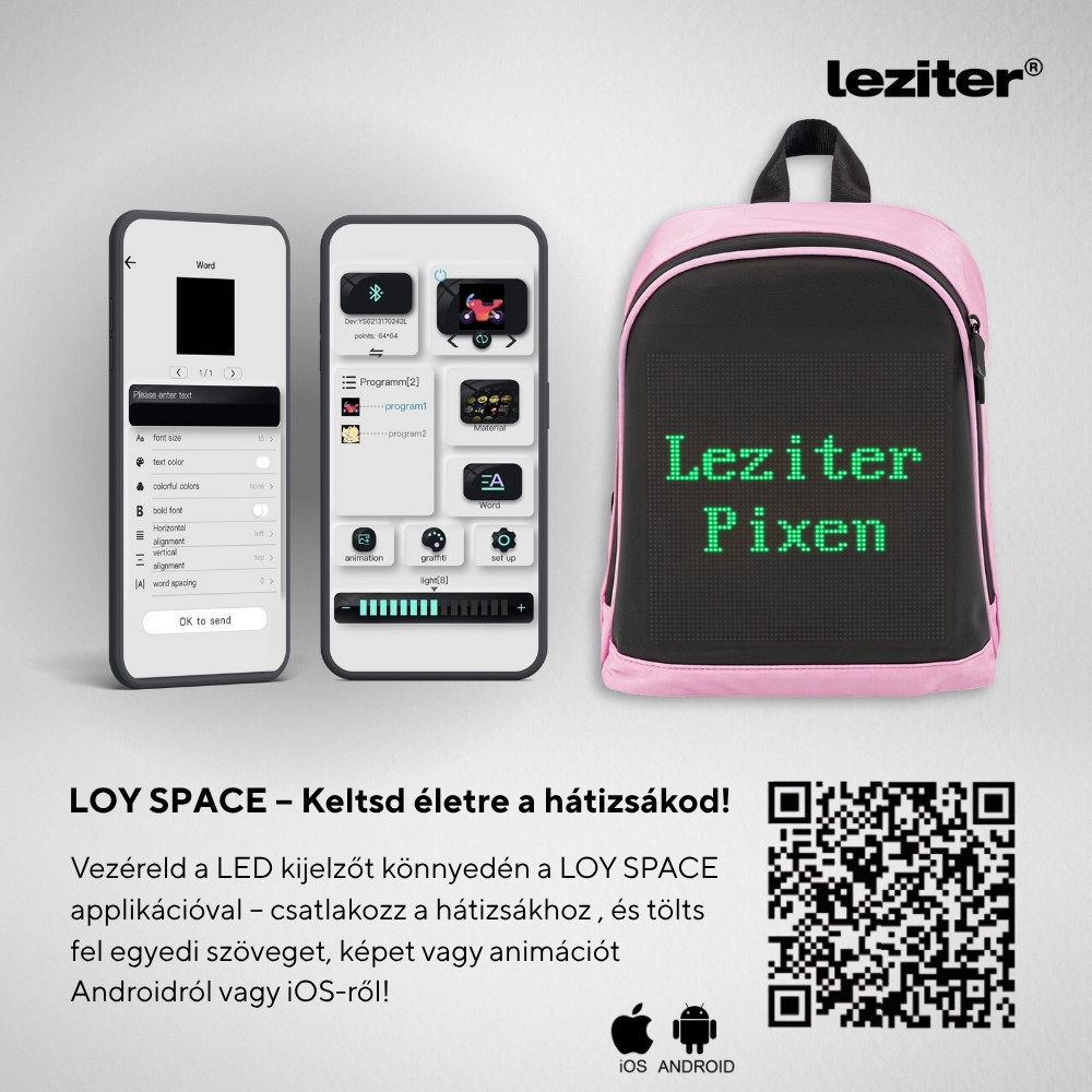 Ha szeretnél saját üzenetet viselni nap mint nap, vagy csak feldobnád a megjelenésed, a Leziter Pixen LED hátizsák megbízható társad lesz benne.