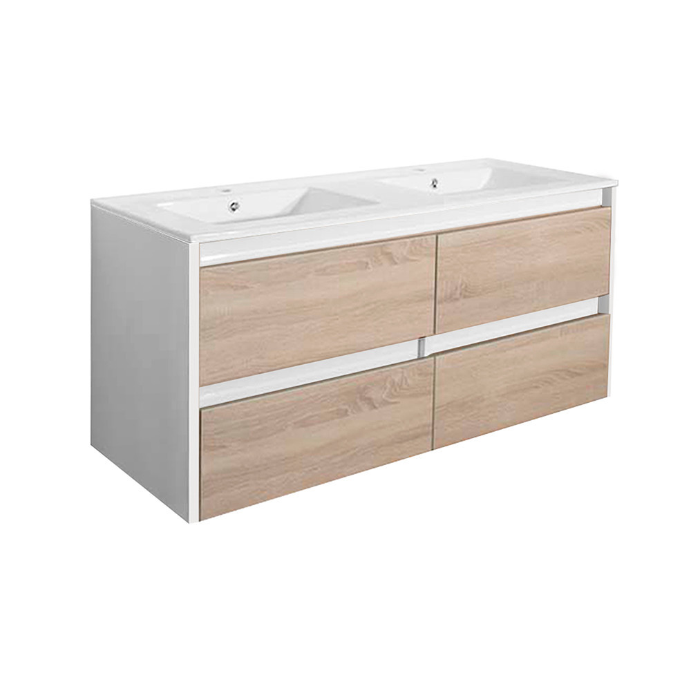 A csomag része a bútorra tökéletesen illeszkedő, fehér színű, dupla medencés kerámia mosdó is, amely két csaptelep számára kialakított hellyel rendelkezik. így nem kell külön keresni a hozzáillő mosdót. A csomag nem tartalmazza a csaptelepeket és a leeresztőt!