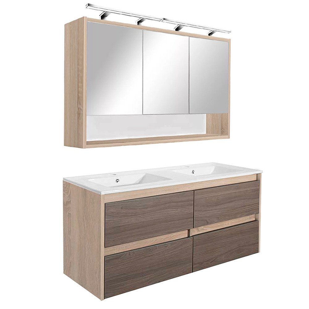 A csomag része a bútorra tökéletesen illeszkedő, fehér színű, dupla medencés kerámia mosdó is, amely két csaptelep számára kialakított hellyel rendelkezik. így nem kell külön keresni hozzá megfelelő mosdót. A csomag nem tartalmazza a lámpát, a csaptelepeket és a leeresztőt!