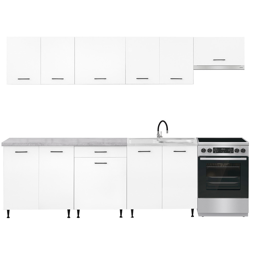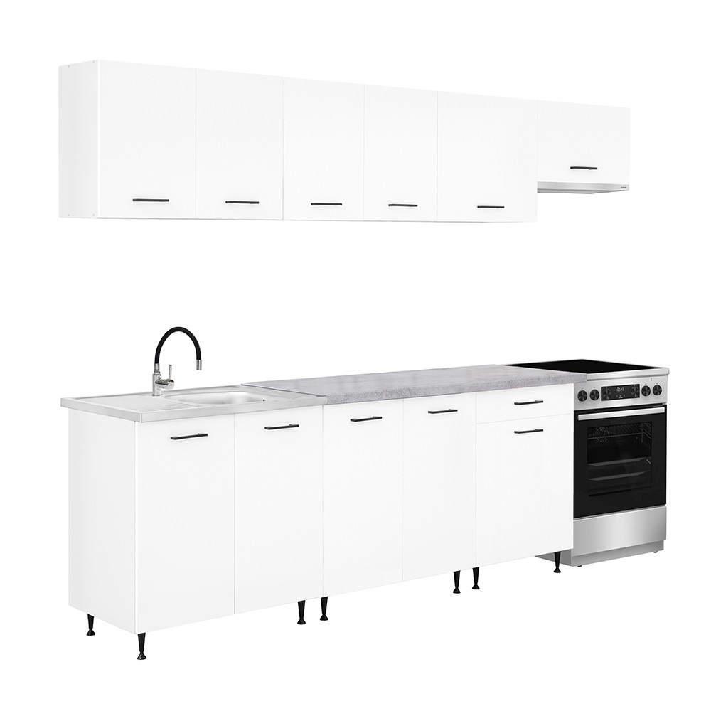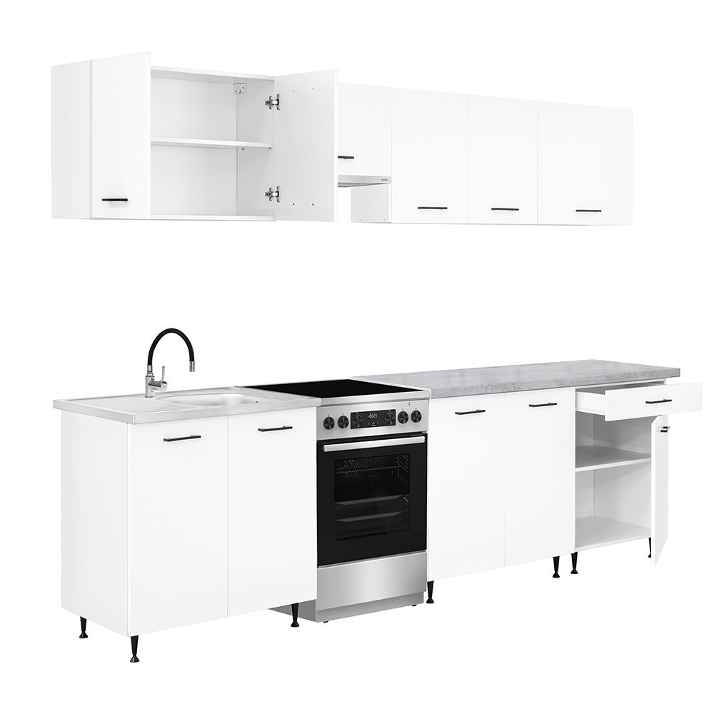 A 280 cm széles konyhabútor négy felső és három alsó szekrényből áll, amelyek praktikus tárolóhelyet kínálnak a konyhai eszközök számára. A két 80 cm-es alsó szekrény alkalmas nagyobb edények vagy konyhai kellékek elhelyezésére, míg a 60 cm-es fiókos–ajtós szekrény jól használható evőeszközök és kisebb tartozékok rendszerezésére.
