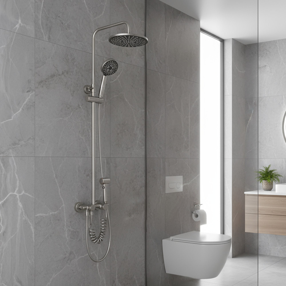 A Rivo zuhanyoszlop szürke kivitelben tökéletes választás modern, ipari vagy minimalista stílusú fürdőszobákba. Egyszerre sugároz eleganciát és praktikumot, miközben kompakt kialakítása miatt kis helyen is könnyen elfér.