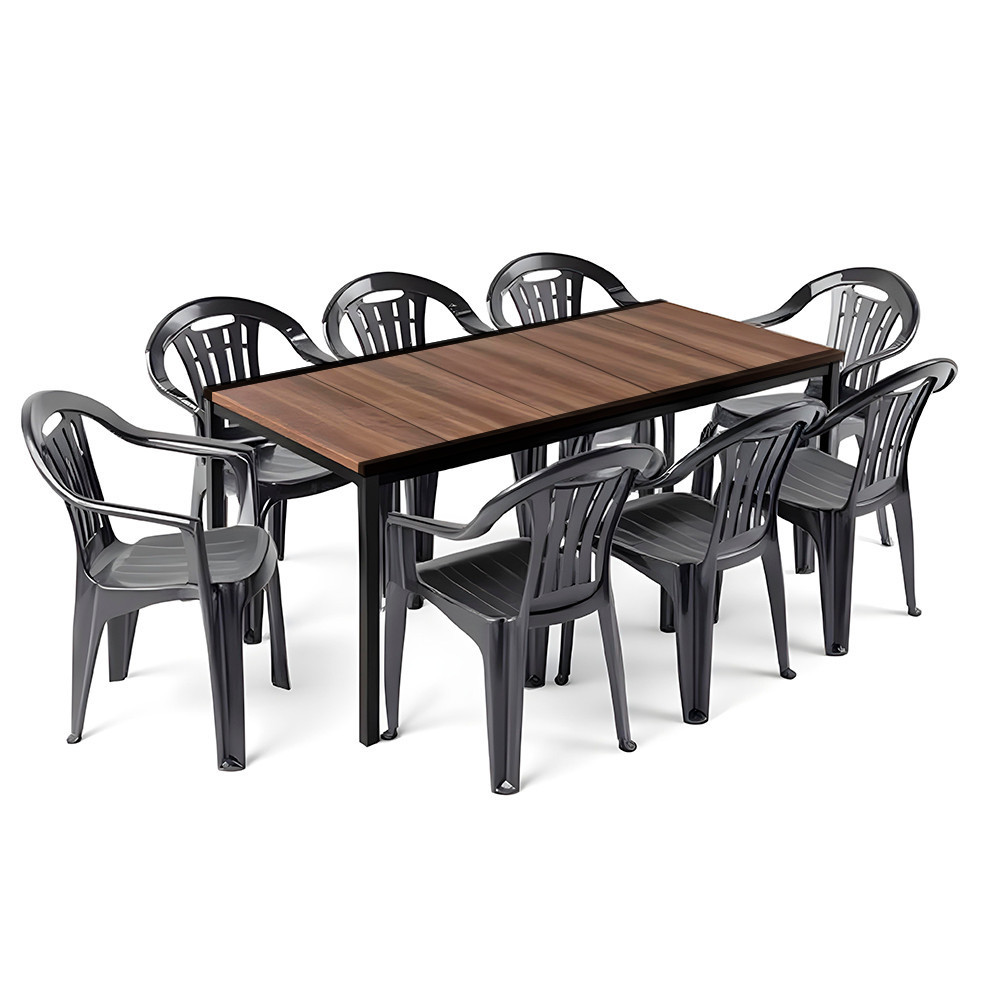 A modern grafit székek rattan-hatású felülete jól harmonizál a dió színű fa hatású asztallappal, így a szett egyszerre időtálló és divatos. Jól mutat zöld növényzet, világos burkolat vagy natúr fa terasz mellett is – tökéletes választás modern vagy klasszikus stílusú kültéri környezetbe.