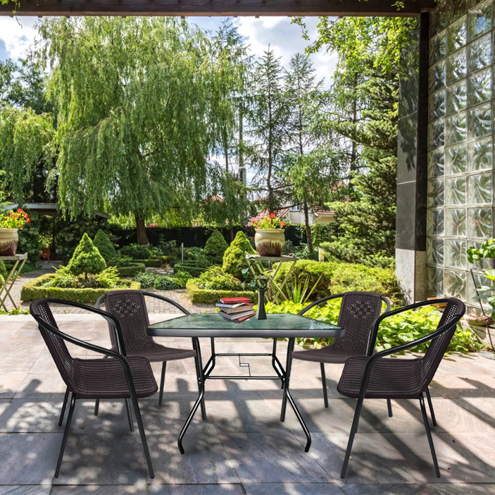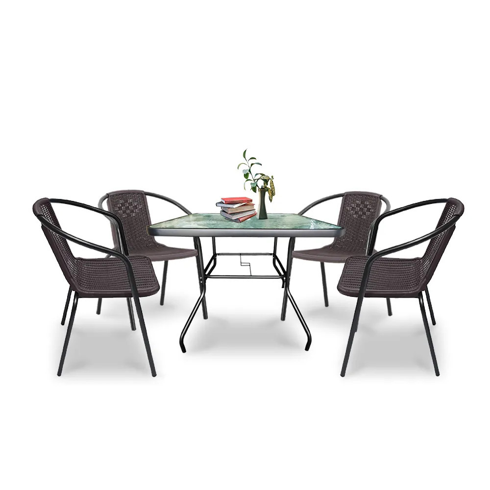 A modern kivitelű kerti bútorkészlet egy kerti üveglapos asztalt és 4 széket tartalmaz. A bútorokat 4 fő számára tervezték. A székek és az asztal lábazata acélból készül. Az asztallap 5 mm-es edzett üvegből készült, amely ellenáll a kisebb karcolásoknak. A műanyag szék ülésanyaga ellenáll az időjárási viszonyoknak. Előnye az ergonómikusan profilált ülés és karfa, amelyek tehermentesítik a vállakat pihenés közben.