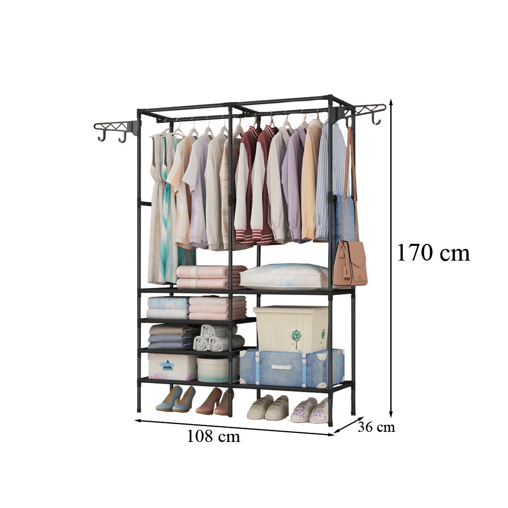 - Multifunkcionális kialakítás: Az állvány több polccal és egy akasztórúddal rendelkezik, amelyek lehetővé teszik különböző típusú ruhák, cipők és egyéb kiegészítők tárolását.