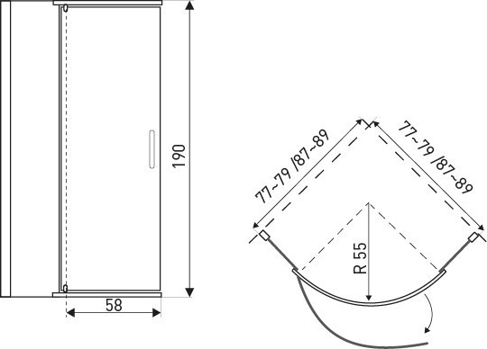 - Méretek: 90 × 90 × 190 cm – tágasabb ív, kényelmes váll-tér