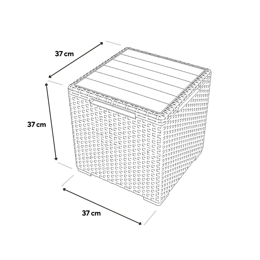 Az asztal teteje könnyedén felnyitható, így kiegészítő tárolóhelyet biztosít a kerti eszközöknek, párna- és takarótárolásra is ideális. A tető stabil felületet nyújt, amit asztalként is használhatsz, legyen szó italokról vagy kerti dekorációról.