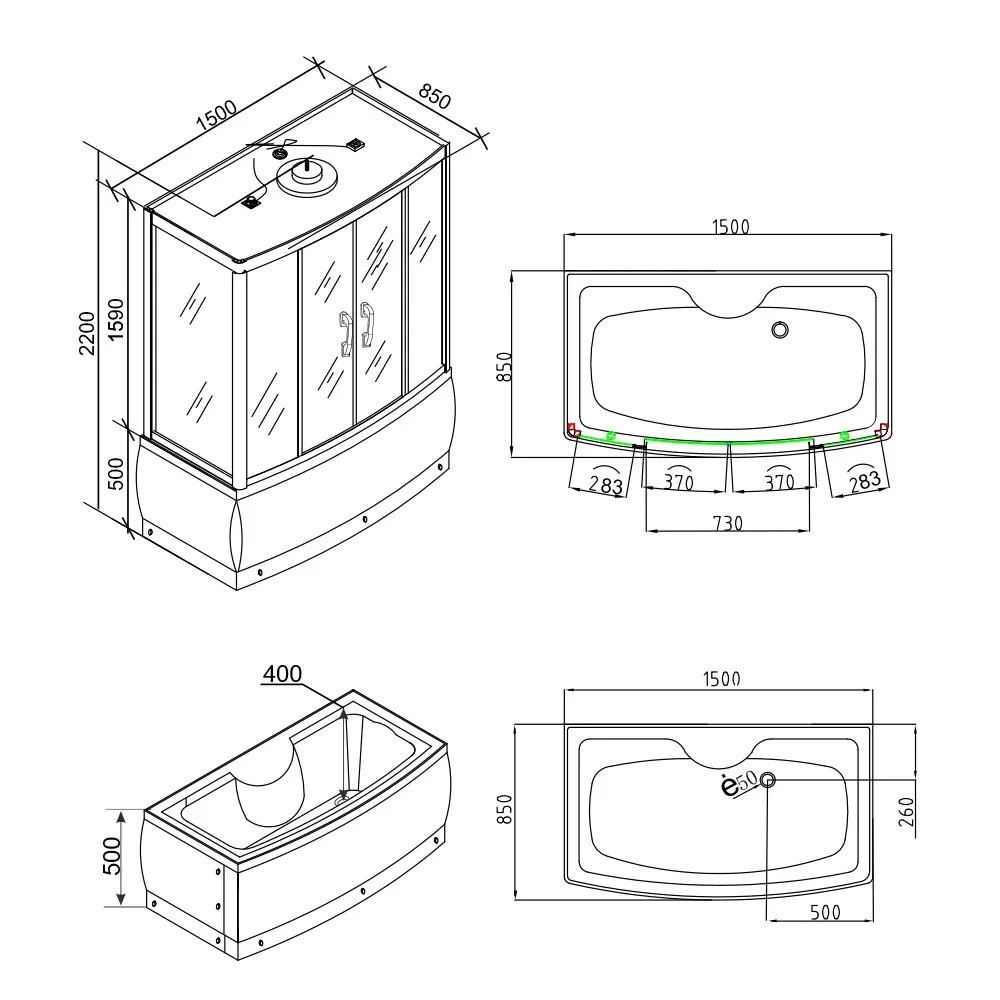 Emilia 85x150 cm hidromasszázs kádkabin elektronikával - Black