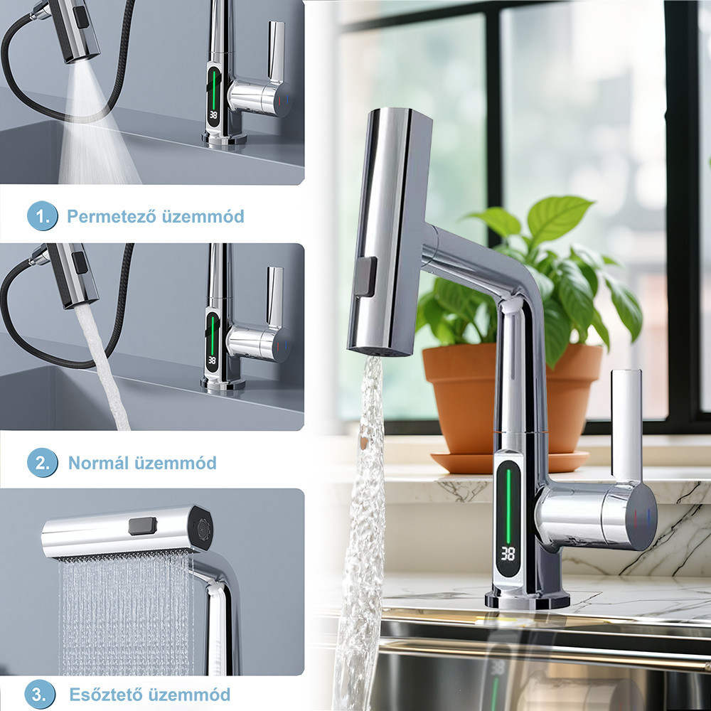Mara mosogató csaptelep multifunkciós fejjel digitális kijelzővel króm