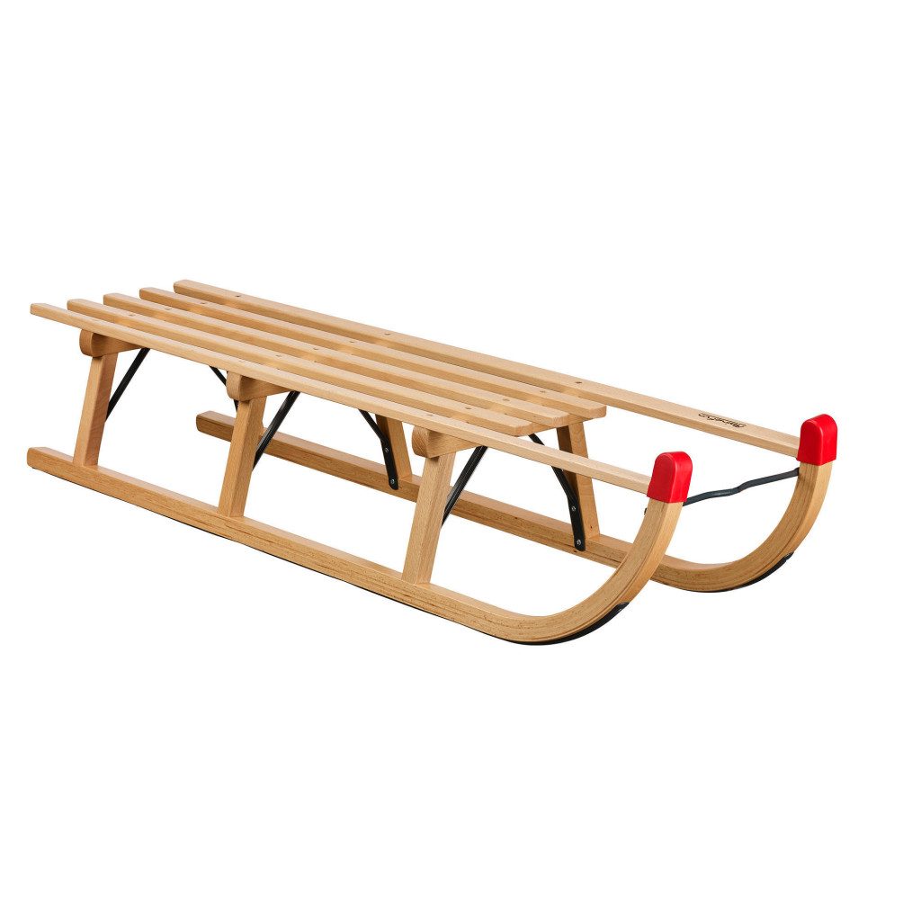 2-3 személyes nagyon szép modern kivitelű szánkó. Hajlított fából készült csúszófelületét vasborítással készítik, amely garantálja a kiváló csúszási és irányíthatósági tulajdonságait. Ütközés elnyelőként műanyagvédőkkel van ellátva.
