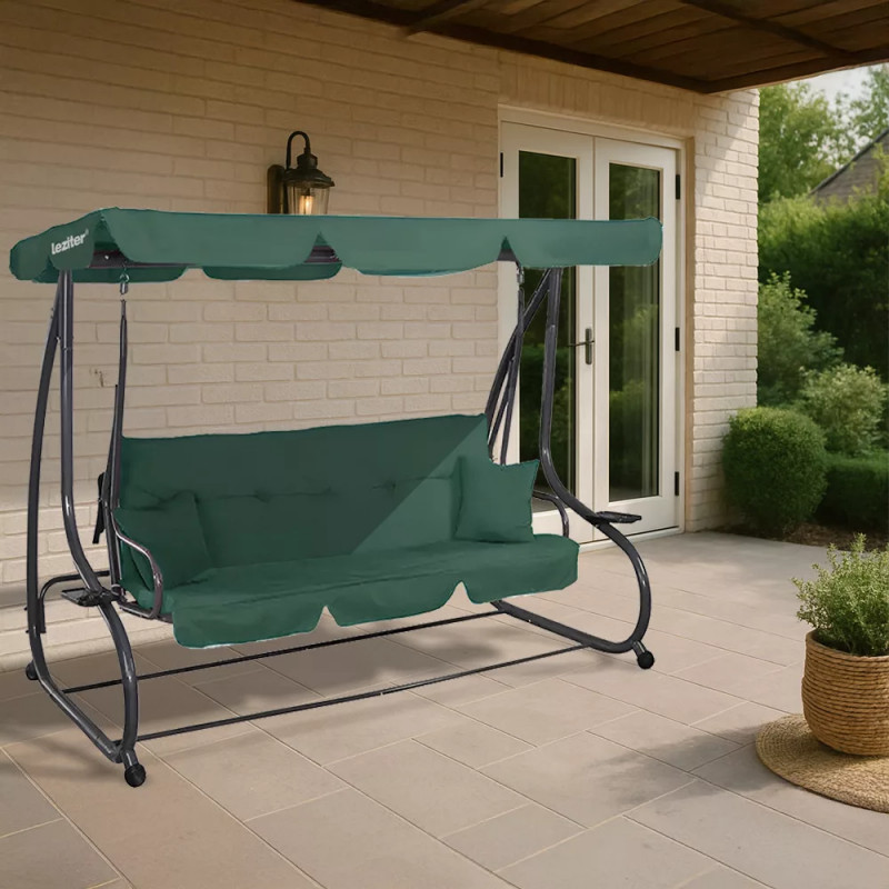 Ez a prémium minőségű, háromszemélyes hintaágy ideális választás minden kertbe vagy teraszra! 200 x 110 x 165 cm-es mérete bőséges helyet biztosít akár három ember számára, miközben stabil kialakításának köszönhetően masszív és biztonságos.