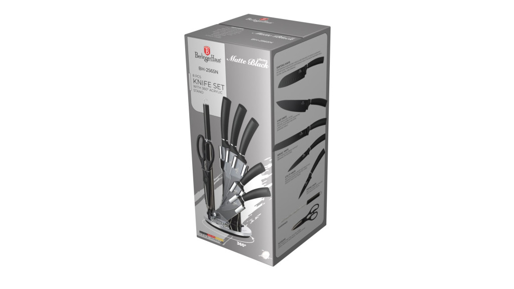 A késekhez tartozó akril állvány 360°-ban elforgatható, így könnyen hozzáférhetőek és tárolhatóak a kések.