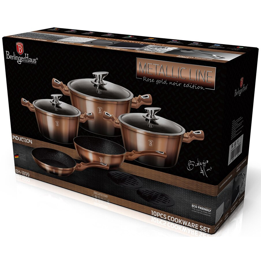 A Berlinger Haus Metallic Line Rosegold Noir kovácsolt alumíniumból készült edények három réteg márványbevonata és a turbó indukciós talp lehetővé teszi, hogy ételei energiatakarékosan és gyorsabban elkészüljenek.