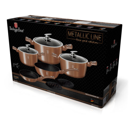 A Berlinger Haus Metallic Rosegold Line kovácsolt alumíniumból készült edények három réteg márványbevonata és a turbó indukciós talp lehetővé teszi, hogy ételei energiatakarékosan és gyorsabban elkészüljenek.
