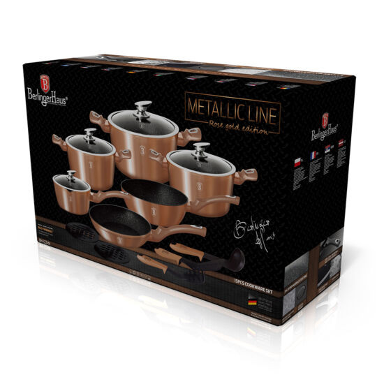 A Berlinger Haus Metallic Rosegold Line kovácsolt alumíniumból készült edények három réteg márványbevonata és a turbó indukciós talp lehetővé teszi, hogy ételei energiatakarékosan és gyorsabban elkészüljenek.