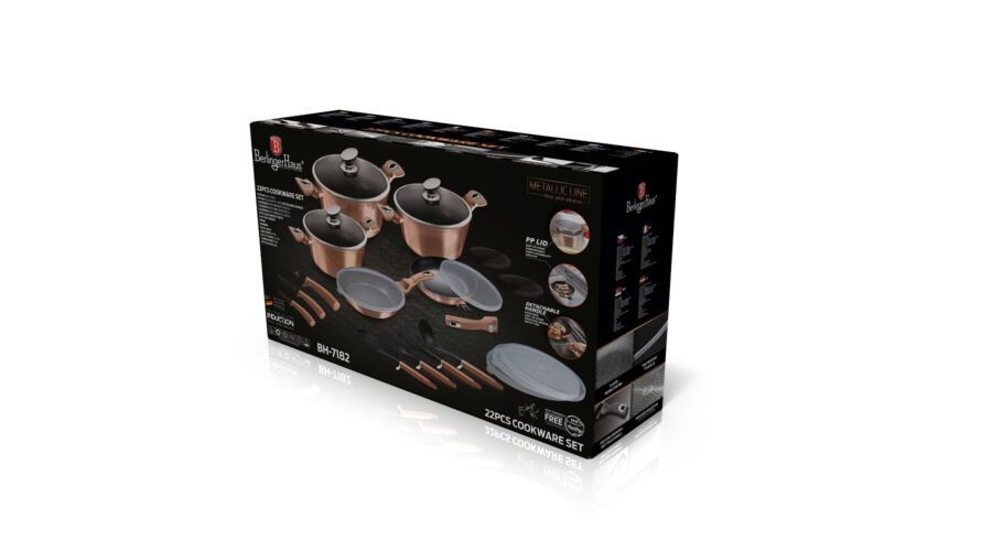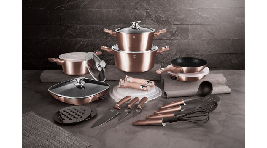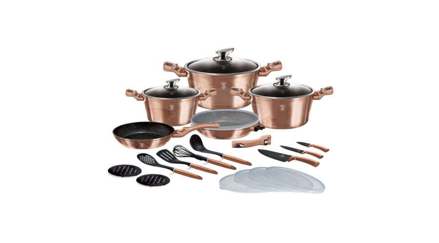 A Berlinger Haus Metallic Rosegold Line kovácsolt alumíniumból készült edények három réteg márványbevonata és a turbó indukciós talp lehetővé teszi, hogy ételei energiatakarékosan és gyorsabban elkészüljenek.