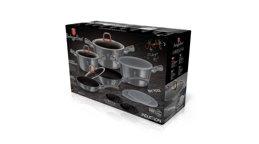 A Berlinger Haus Moonlight Collection kovácsolt alumíniumból készült edények három réteg titán bevonata és a turbó indukciós talp lehetővé teszi, hogy ételei energiatakarékosan és gyorsabban elkészüljenek.