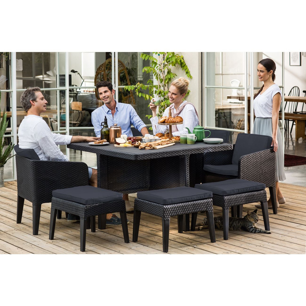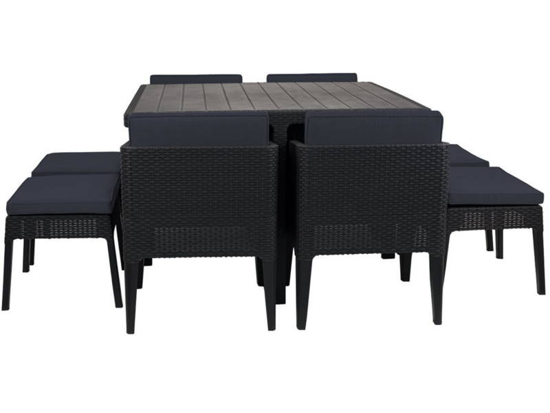 Kivételesen elegáns és modern, kilenc elemes kerti bútor garnitúra: a garnitúra egy nagy asztalból, 4 kényelmes fotelből és 4 puff szerepét is betöltő lábtartóból áll. A termék modulos szerkezetű, használat után betolhatja a foteleket és a puffokat az asztal alá, helyet megtakarítva ezzel a helyiségben. A garnitúra ideális választás mindazok számára, akik szeretnek a friss levegőn étkezni. Tökéletesen alkalmas családi grill vagy kerti parti szervezésére. A termék további előnye a szép, természetes rattan hatású felületkialakítása és a kényelmes párnák. Könnyű tisztán tartani. A termék ellenáll az UV sugárzásnak és az időjárás viszontagságainak. Gyors összeszerelés.