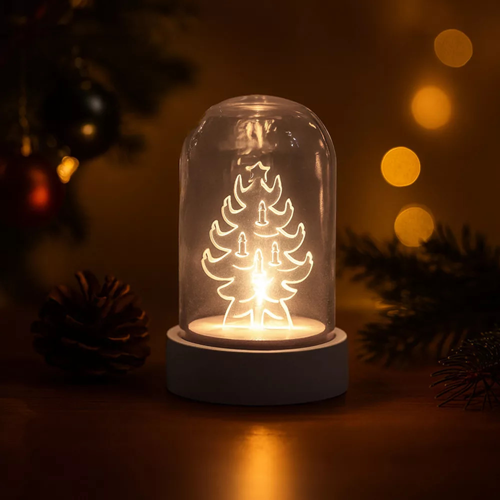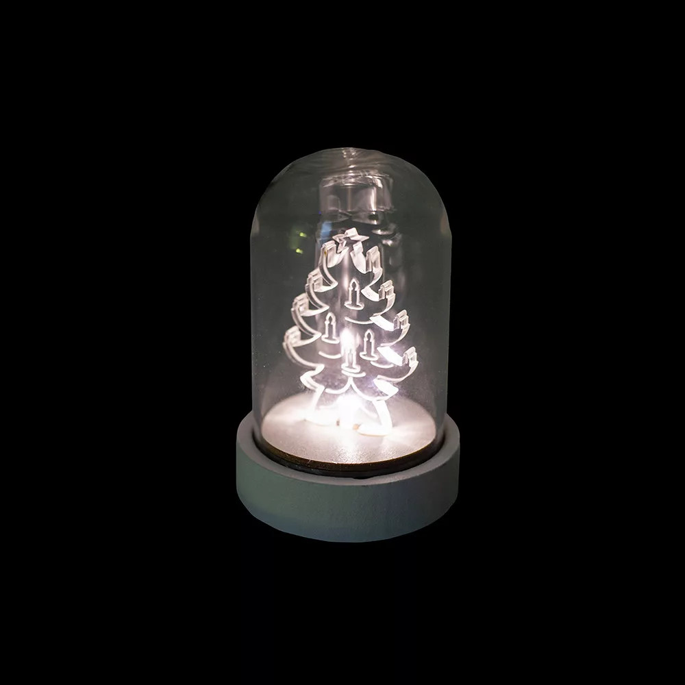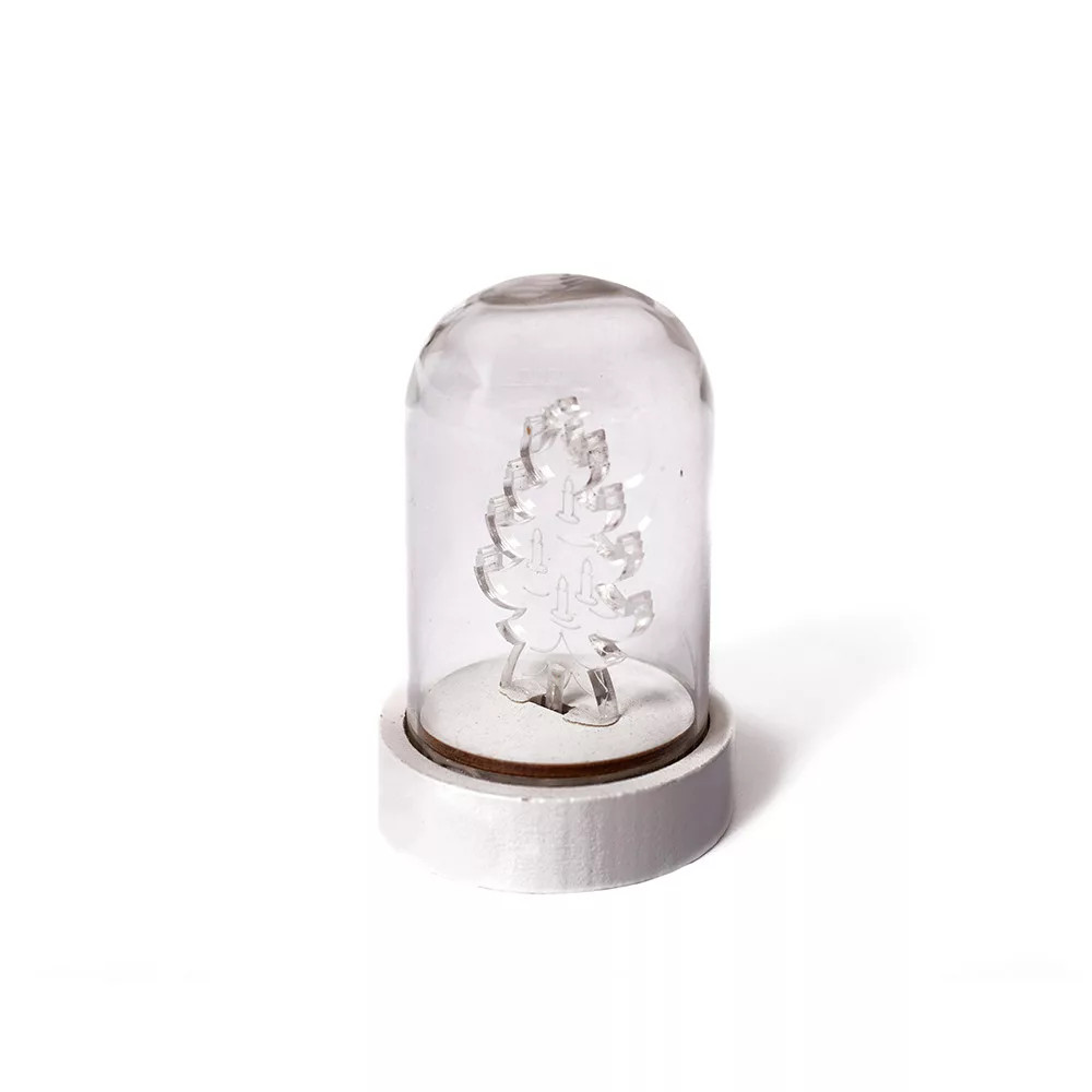 Fenyőfa üveg asztaldísz, 9 cm, meleg fehér, elemes