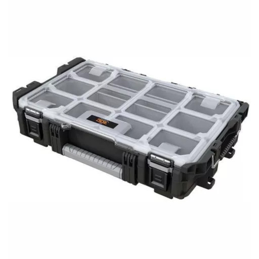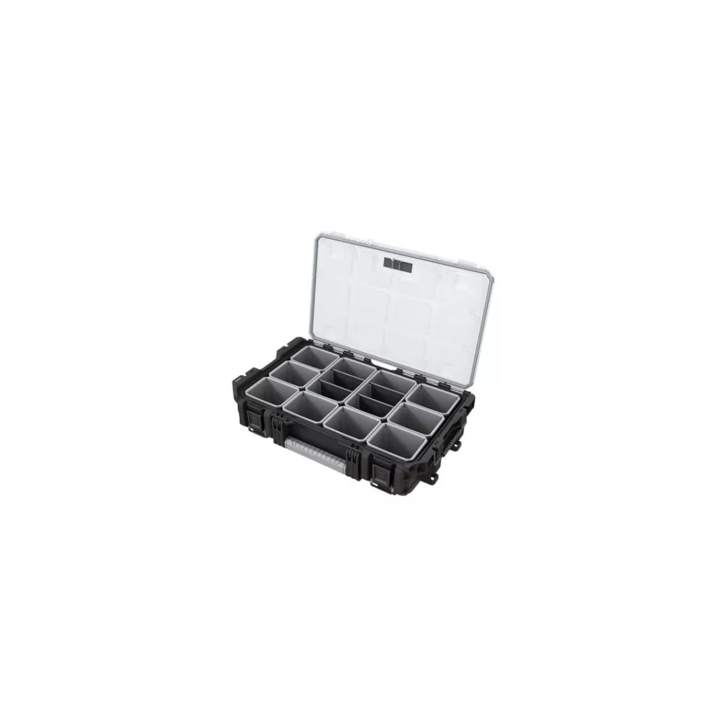 A ROC Pro Gear 1.0 Rendszerező kompakt kialakításával és strapabíró szerkezetével olyan szakembereknek való, akik funkcionális, hordozható és strapabíró rendszerezőt keresnek, amely nap mint nap képes elvégezni a munkát. Ez a tartós, nagy ütésállóságú műanyagból készült professzionális rendszerező fém retesszel és három fogantyúval rendelkezik, amelyek többféle hordozási lehetőséget kínálnak. Tartalmaz 8 kis és 2 széles kivehető tárolót a munka közbeni gyors hozzáférés érdekében. A víz- és porálló peremmel kiegészített szervezővel mindenféle időjárási körülmények között dolgozhatsz. A ROC Pro Gear 1.0 Rendszerező kompatibilis a moduláris és egymásra rakható Professional Tool Storage Rendszer 1.0 és 2.0 (kivéve a kompakt rendszerezőt) szerszámtároló rendszerrel.