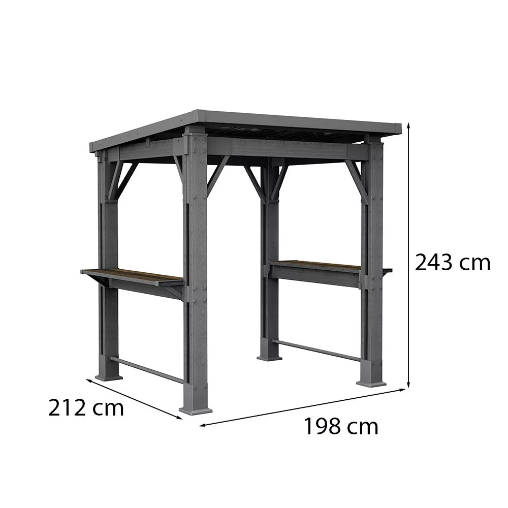 A 212 cm széles, 198 cm mély és 243 cm magas, grafit színű Keter Grill Gazebo műanyag kerti pavilon nemcsak stílusos, hanem funkcionális is. UV-álló tető véd az időjárás viszontagságaitól. Két oldalán beépített polcok segítik az előkészítést, tálalást vagy akár az italok elhelyezését. A műanyag szerkezet nem korhad, nem rozsdásodik, nem igényel újrafestést. Strapabíró, mégis könnyen mozgatható, és nem kell szakembert hívnod az összeszereléshez sem: két ember néhány óra alatt felállítja!