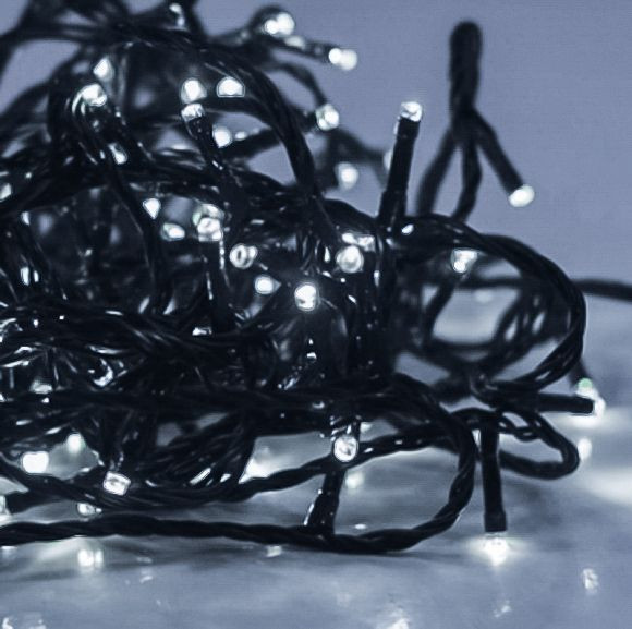 Hideg fehér fénye kristálytiszta színű, elegáns hangulatú. Zöld kábele fenyőfán alig látszódik, de bármilyen sötét háttéren kiválóan érvényesülnek a LED-ek fényei rajta.