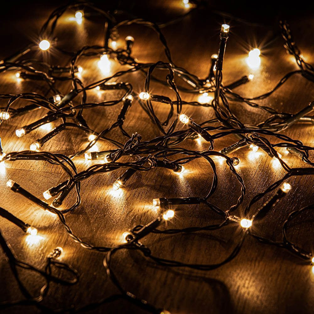 Meleg fehér fénye a délutáni napsugarak barátságos színét idézi, kellemes hangulatot teremtve. Zöld kábele fenyőfán alig látszódik, de bármilyen sötét háttéren kiválóan érvényesülnek a LED-ek fényei rajta.