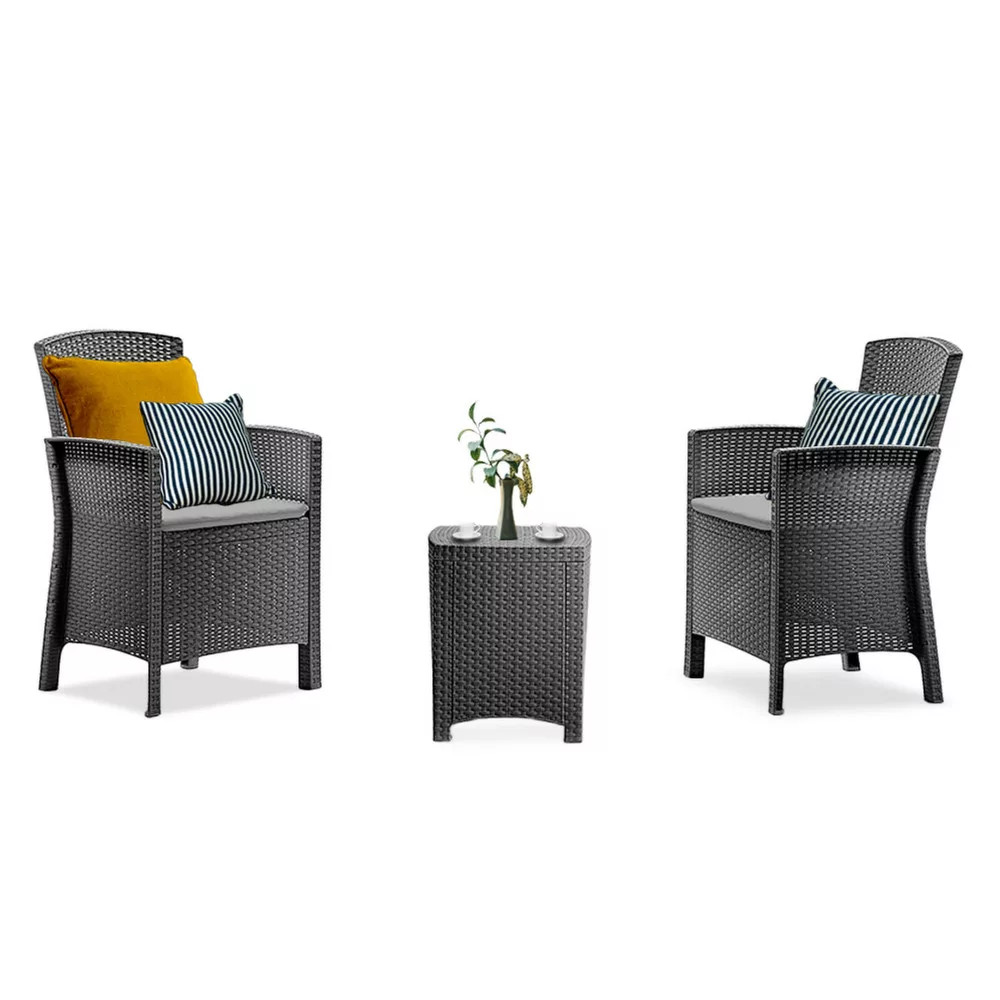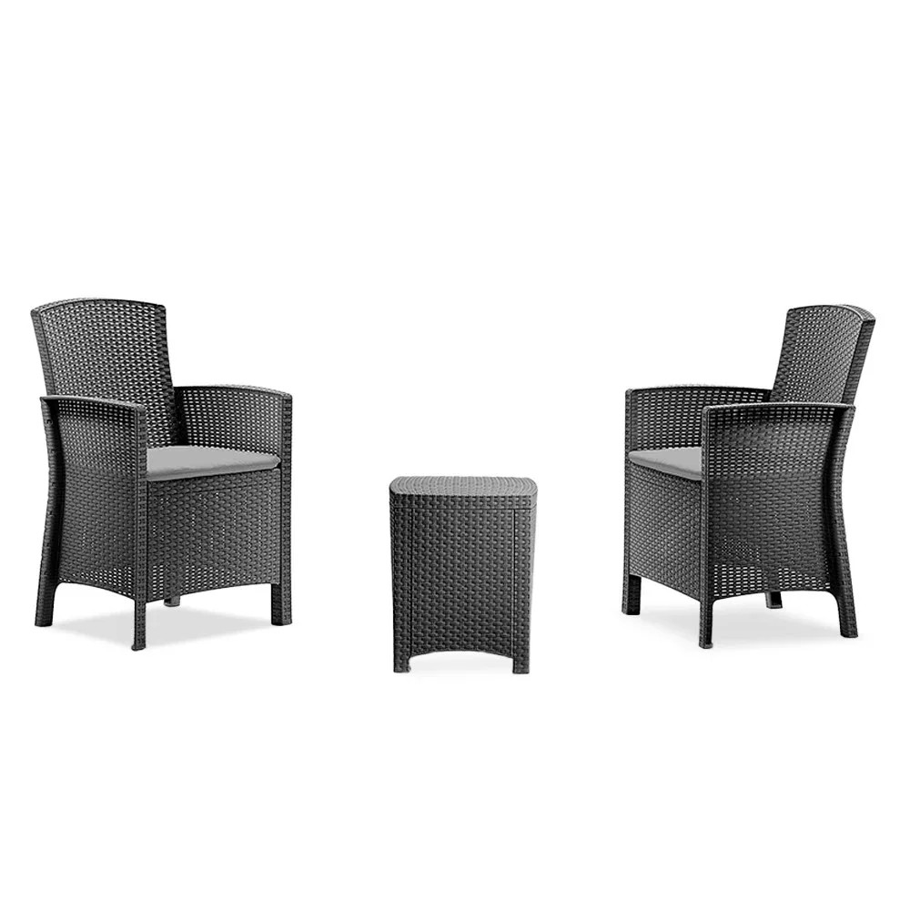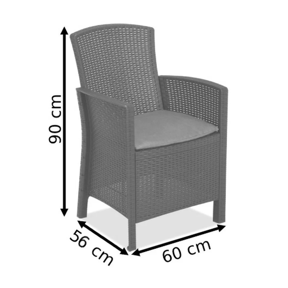Ez egy rattan stílusra emlékeztető elegáns bútor szett két fotellel és egy négyszögletes asztallal. Ez a bútor szett kellemessé teszi a kertben vagy a teraszon töltött nyári napokat. A termékekhez stílusos színű puha párnákat mellékelünk. A könnyű és egyúttal stabil szerkezetű bútorok tisztítása nagyon egyszerű. A szett ellenálló a sérülésekkel és az időjárás hosszan tartó viszontagságaival, illetve az UV sugárzással szemben is.