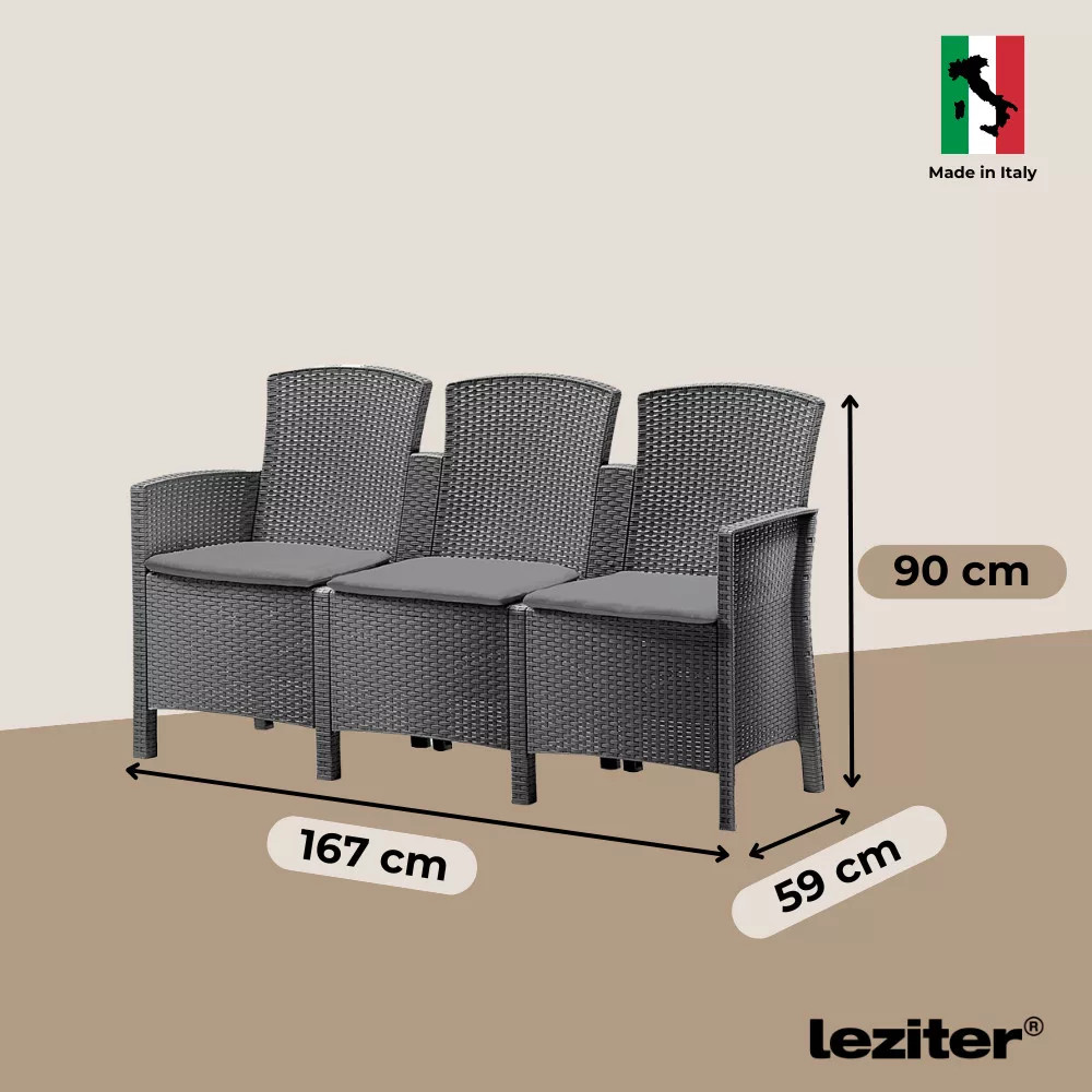 A grafit szín és az eredeti rattan hatású textúra miatt ez a kanapé könnyedén illeszkedik modern és klasszikus stílusú kertekbe, teraszokra vagy akár éttermi területekre is. Kompakt mérete (167 x 59 x 90 cm) lehetővé teszi, hogy kisebb teraszokon is jól mutasson, miközben elegendő helyet biztosít a kényelmes ücsörgéshez.