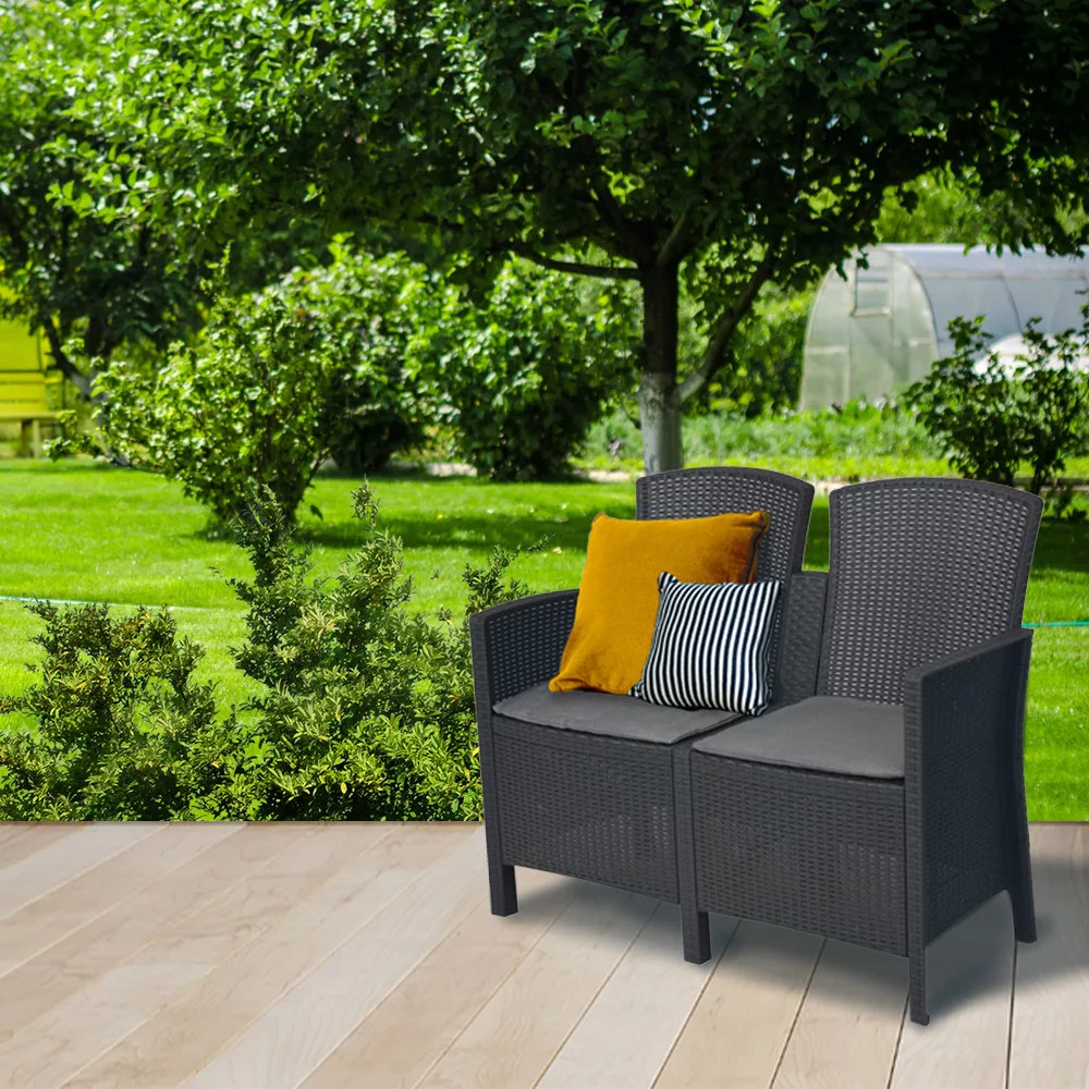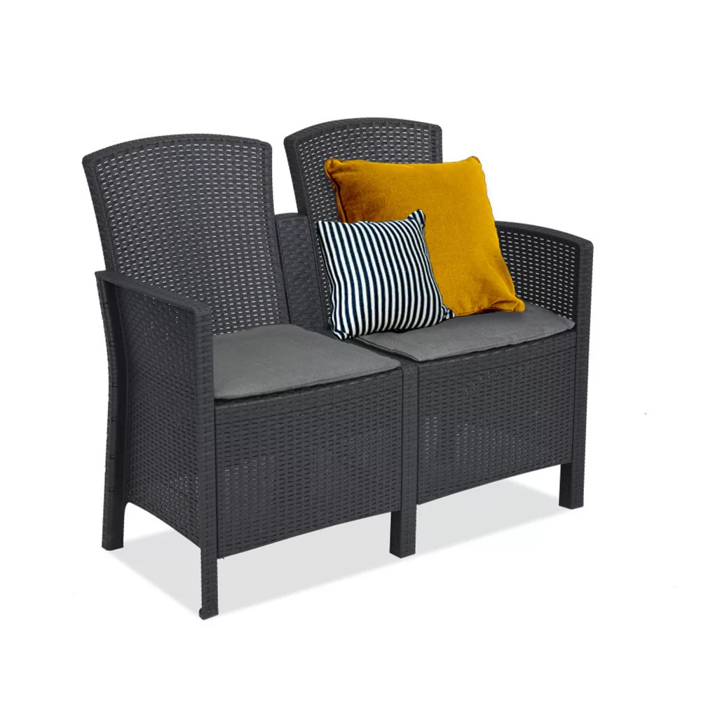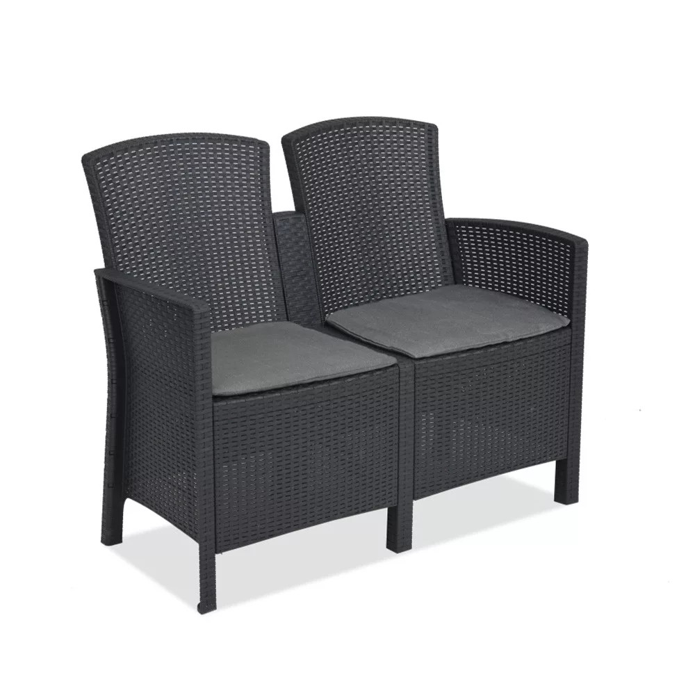 Ez egy elegáns és kényelmes két személyes kerti kanapé párnával kompletten. A grafit szín és az eredeti rattanra emlékeztető felület mind a modern, mind a klasszikusabb stílust kedvelők igényeit kielégíti. Időtálló darab, hiszen az UV sugárzásnak és az időjárás viszontagságainak ellenálló műanyagból készült, kint hagyhatod a tűző napon, vagy egy nyári záporban. A kanapéhoz kényelmes, színben harmonizáló ülőpárna is tartozik, melyek fokozzák a kényelmét. Könnyen mozgatható, de mégis stabil, nem borulékony darab, így jól bírja a terhelést is. A Lima két személyes kerti kanapé sokoldalú kiegészítő lehet otthonodhoz, kertedhez, de egy étterem teraszán is kényelmes ülőhelyként szolgálhat.