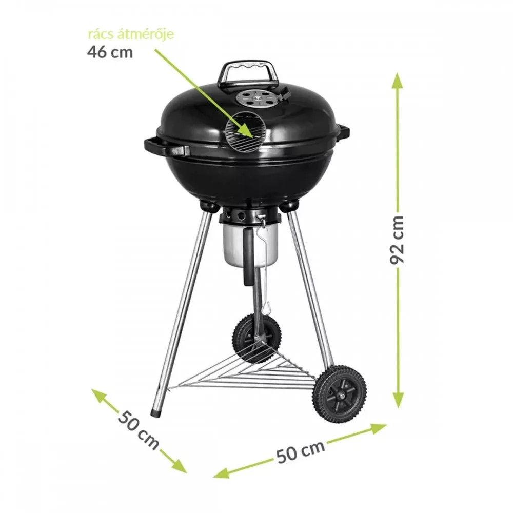 A kerek grill táljának fogantyúval ellátott záró fedele van. A fedél képes a levegő áramlásának beállítására, ami lehetővé teszi az ételek tökéletes elkészítését.A kerek grillen két légzőnyílás van - a fedélben és a hamutartóban.Funkcionális előny az alsó polc, amely megkönnyíti a grillezést és a praktikus kiegészítők tárolását.