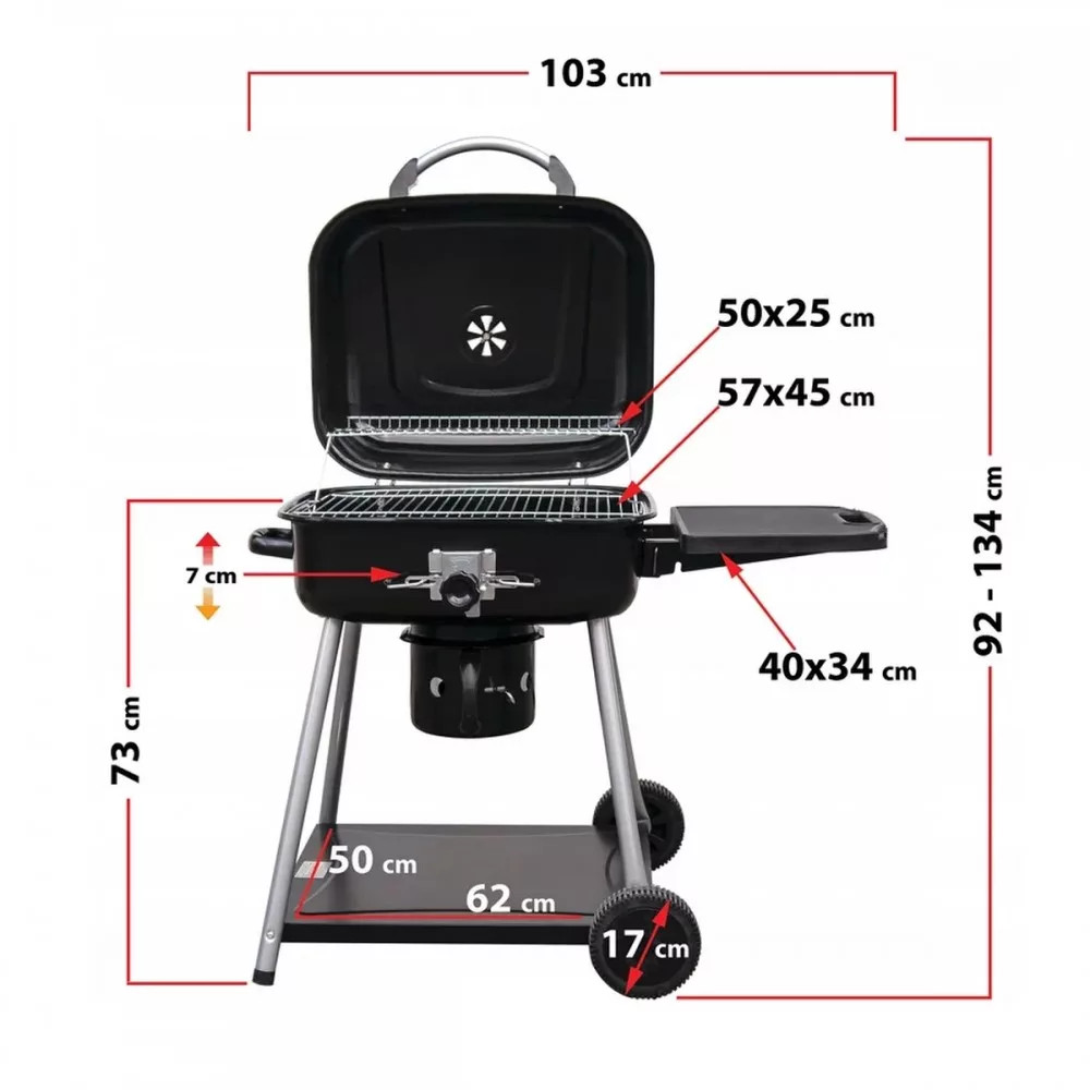A széngrill rostély képes a magasság és a fűtőelem zökkenőmentes beállítására , amely lehetővé teszi az ételek elkészítésének ellenőrzését és tökéletes elkészítését. Funkcionális előny az oldalsó polc és egy további alsó polc, amelyek megkönnyítik a grillezést és a praktikus kiegészítők tárolását. Az állítható szellőzésű fedél lehetővé teszi a hőmérséklet beállítását.