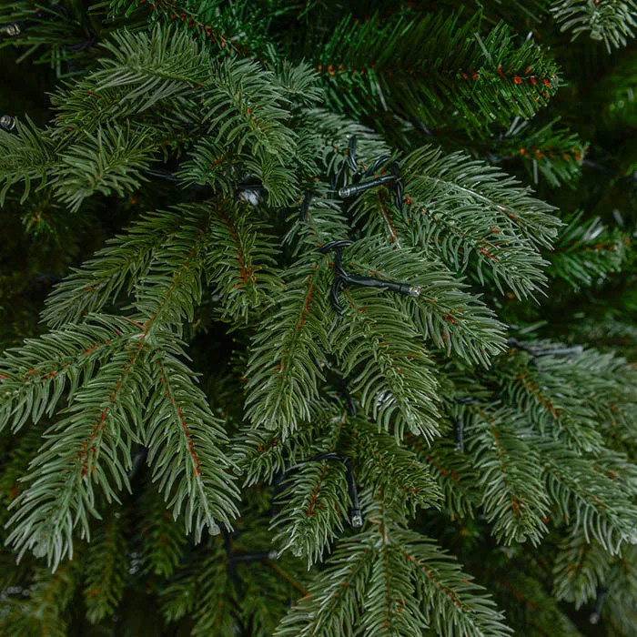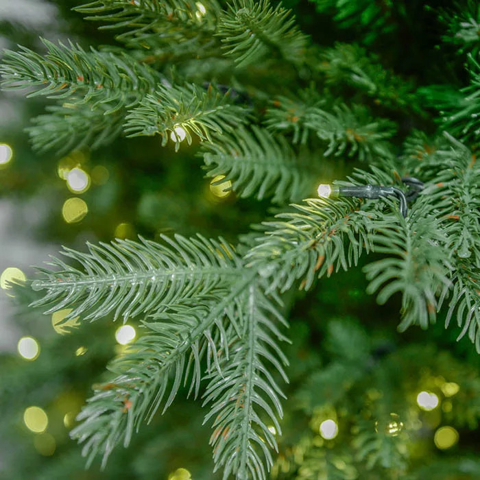 Kevert levelű előre világított műfenyő, szép, természetes lombozattal, formás, élethű színezésű levelekkel. A fenyőfa 310 LED-et tartalmaz, amik meleg fehér színben világítanak.