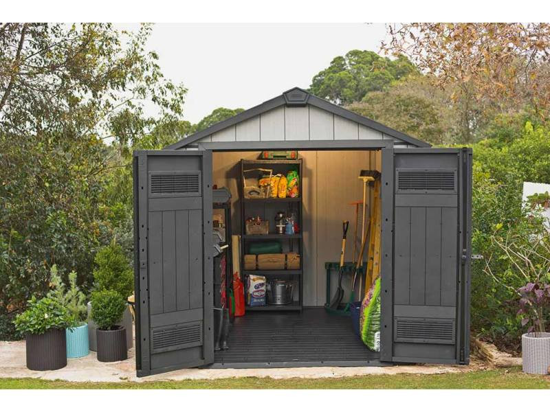Az átgondolt, megerősített acélszerkezetű OAKLAND 757 szerszámos ház elnyeri mindazok tetszését, akik a funkcionalitás és a jó stílus egyesítésének a hívei. Optimális kapacitás, kétszárnyú ajtó, vastag, dupla falú panelek és szolid tető a termék nagyon fontos és praktikus előnyei. A ház tökéletesen komponál a kerti térrel, további előnye a színváltozat módosítása a panelek szabadon választott színre festésének a lehetőségével. A ház belsejében kényelmesen elférnek a nagyobb kerti szerszámok, pl. önjáró fűnyírók, grill, kerti bútorok és sok más kerti tartozékok.