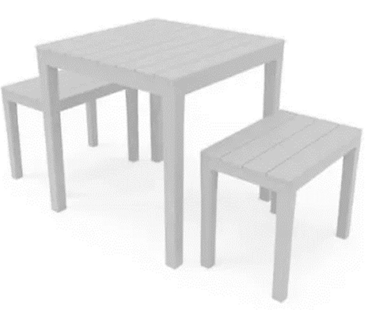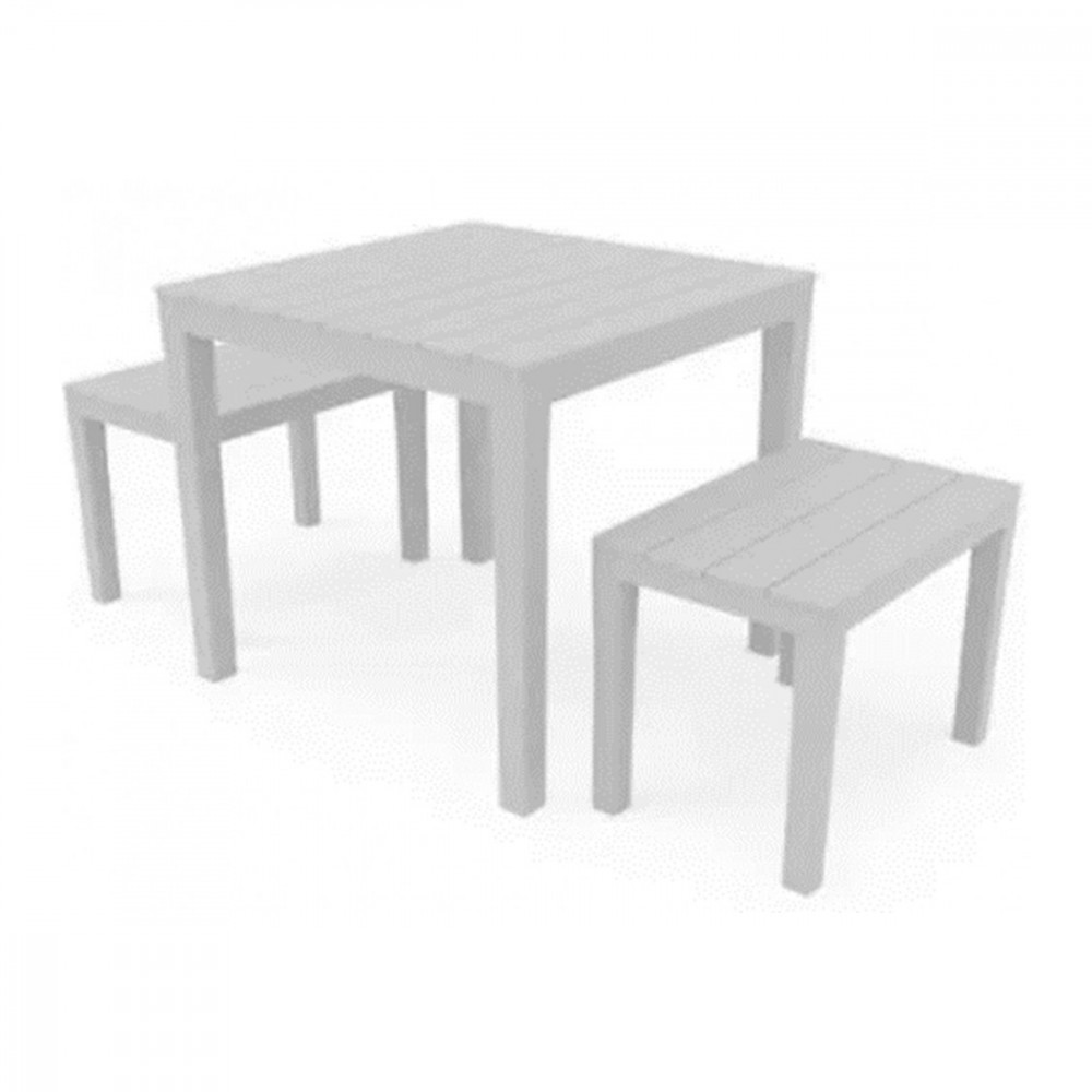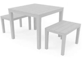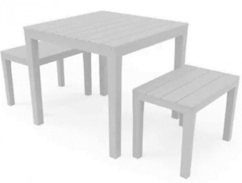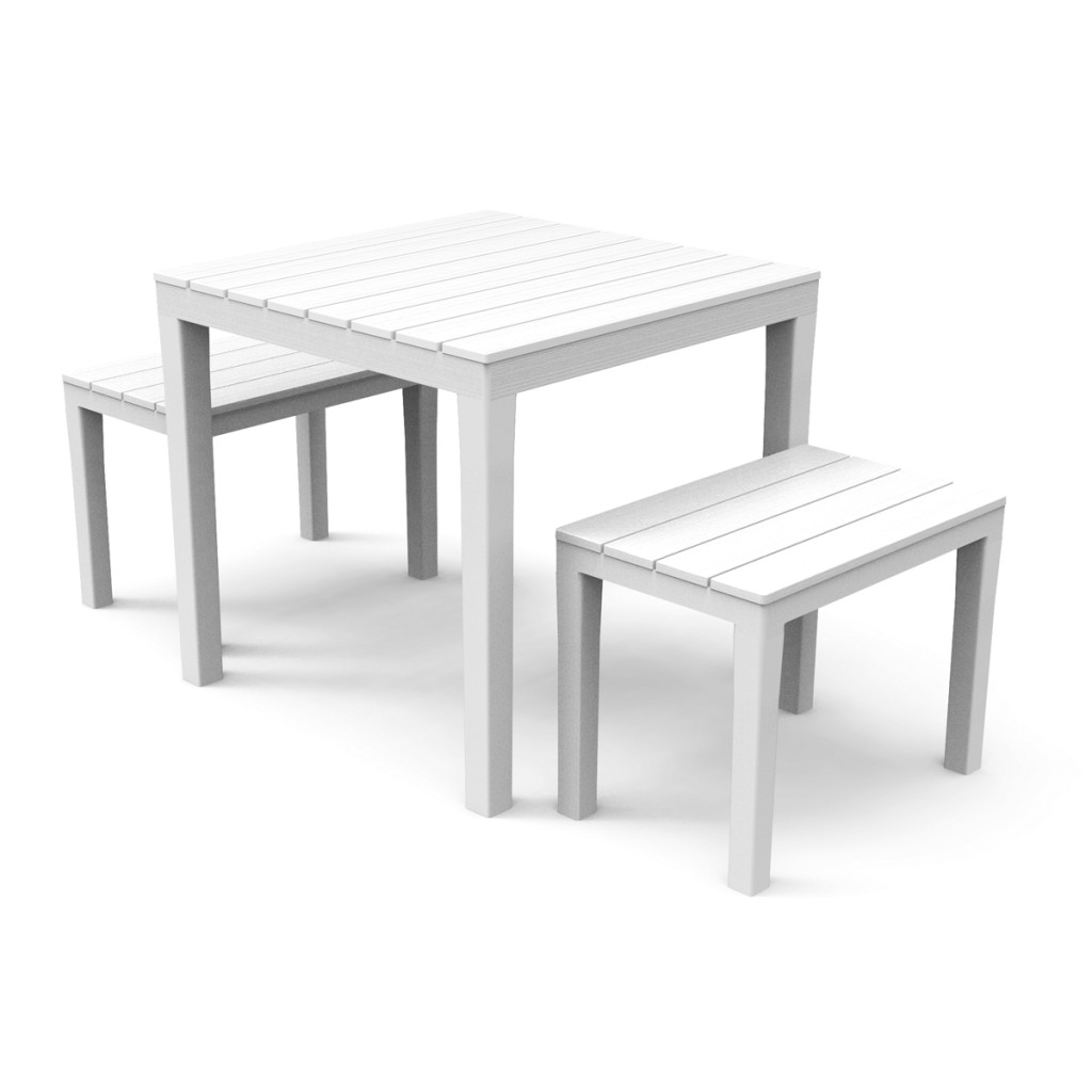 Papua kerti szett. Fehér színben. Stabil erős kis kerti szett. Jó választás lehet nyaralókba, teraszokra. A kis Timor padokat be lehet tolni az asztal alá, így kevés helyet foglal a szett. Fa hatású.
