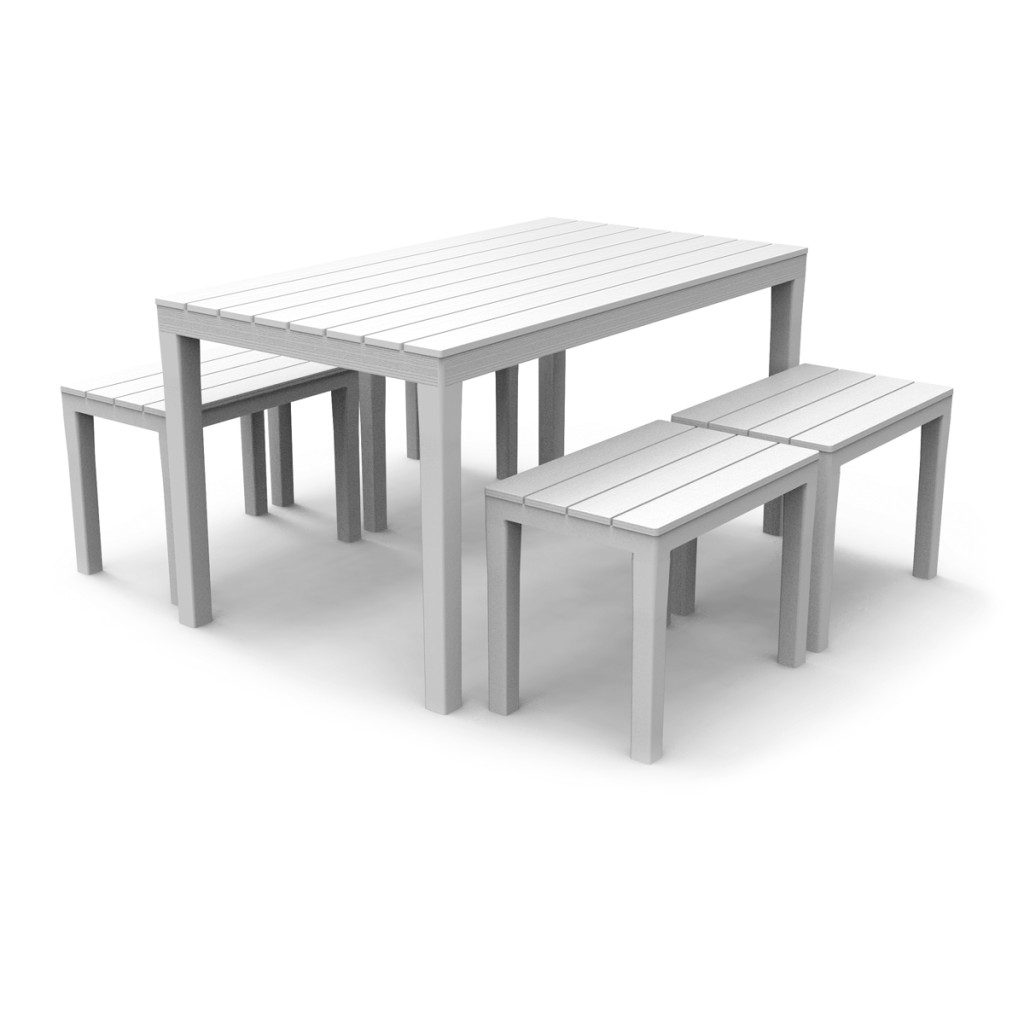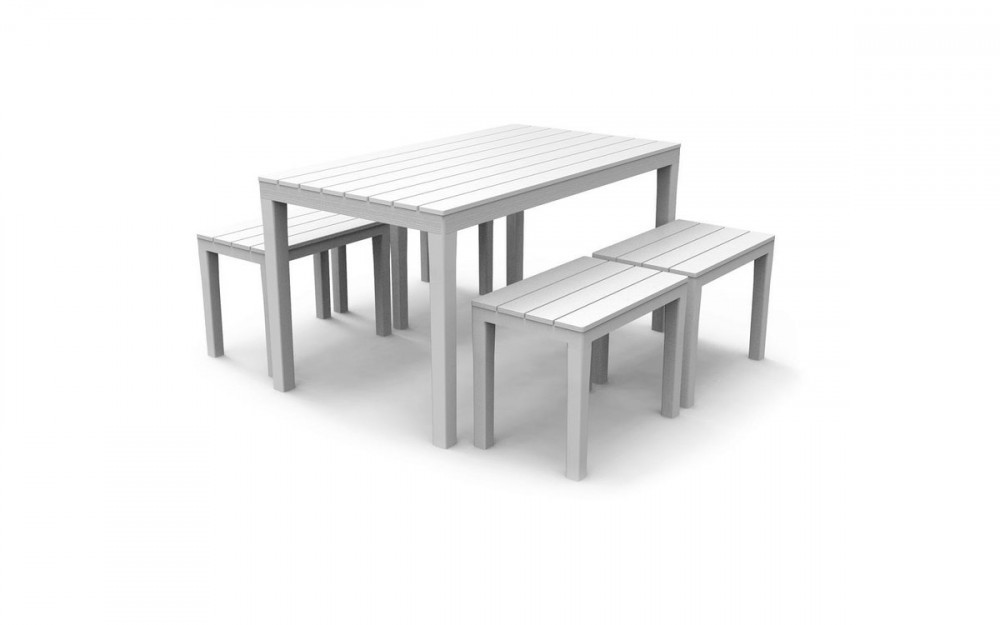 Samoa kerti szett. Fehér színben. Stabil erős kis kerti szett. Jó választás lehet nyaralókba, teraszokra. A kis Timor padokat be lehet tolni az asztal alá, így kevés helyet foglal a szett. Fa hatású.