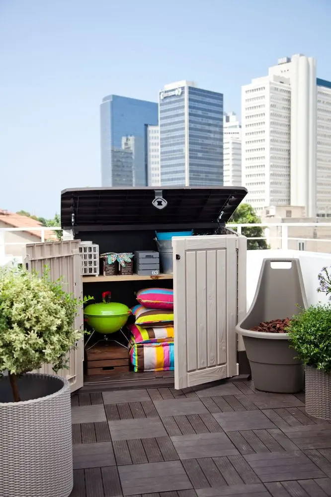 A STORE-IT-OUT MIDI tárolót egyszerű és elegáns mintázat, univerzális színválaszték és természetes fára emlékeztető felület jellemzi. Opcionálisan a polcok beszerelése, amely tovább növeli a termék használati tulajdonságait. A tároló minden olyan helyen beválik, ahol nélkülözhetetlen a kerti tartozékok és háztartási tárgyak tárolása. Az erős szerkezet megvédi a tárolóban tárolt tárgyakat a nedvességtől, a magas minőségű anyag hosszú élettartamot garantálnak.