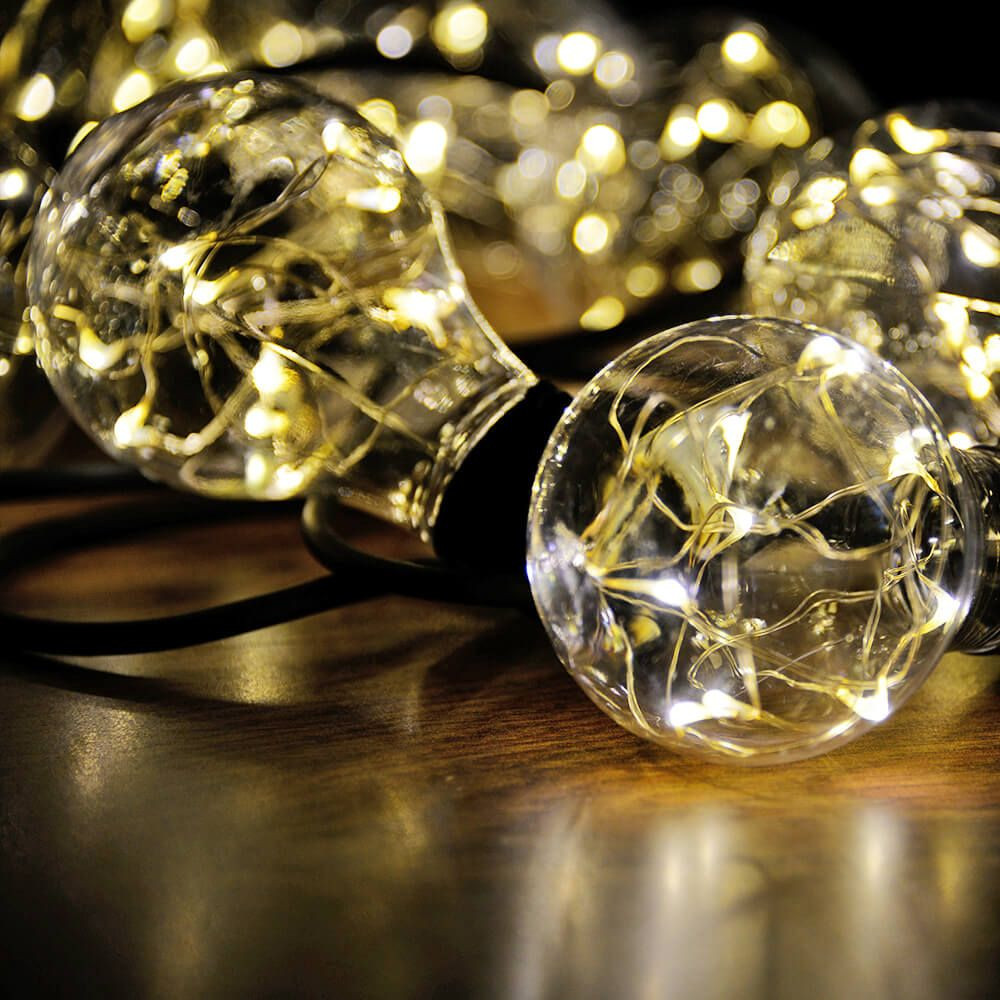 A fénysornak klasszikus villanykörte formájú burái vannak, amikben energiatakarékos Tündérfény LED füzérek tekerednek és világítanak.