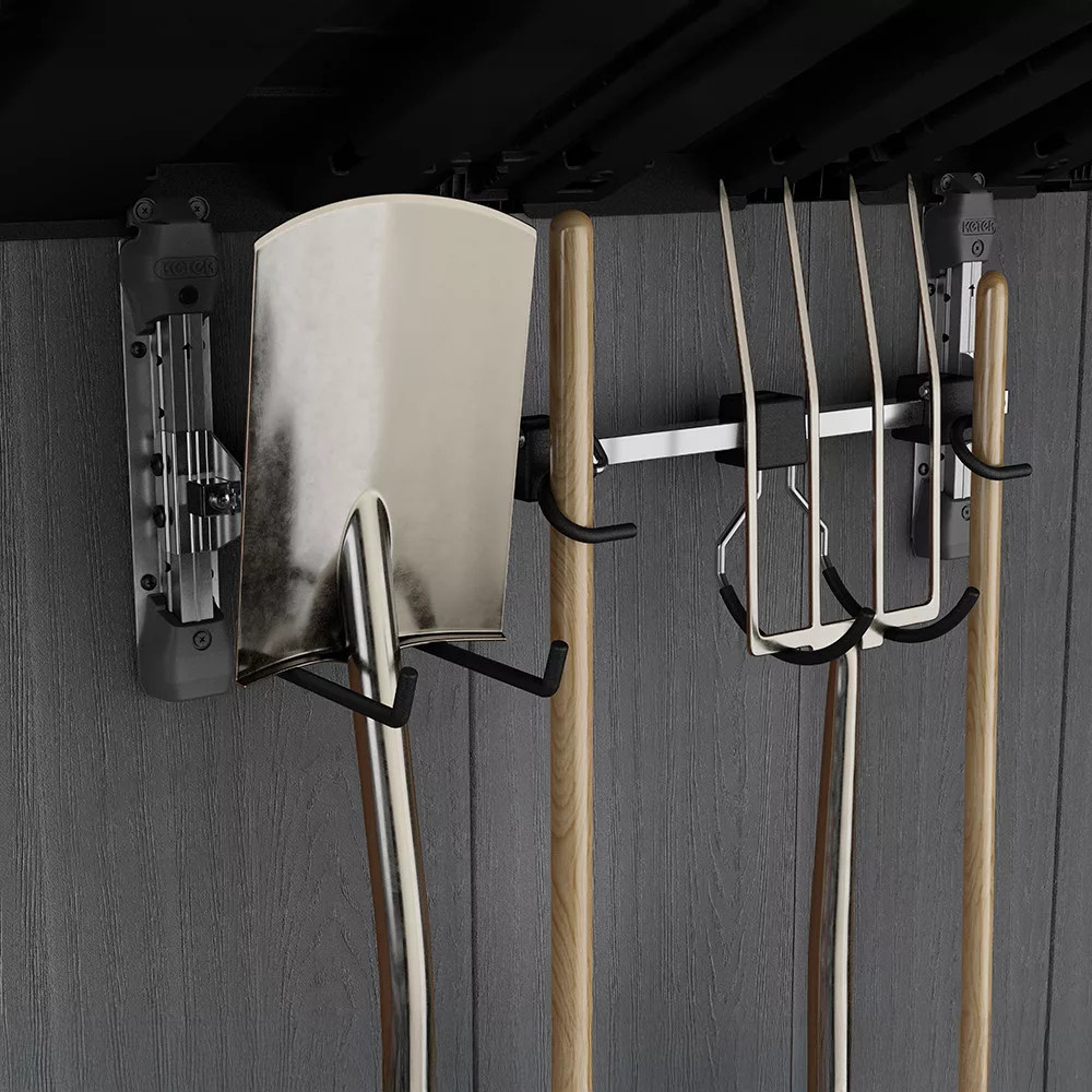 A csúsztatható, pozícióban rögzíthető kampóknak köszönhetően minden szerszám pontosan oda kerül, ahol a legpraktikusabb. Ásót, slagot, vagy egyéb kerti eszközöket is elhelyezhetsz rajta — teljesen személyre szabható rendszer!
