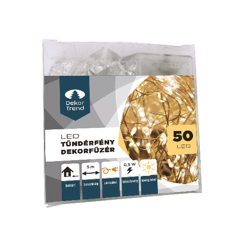 A tündérfény dekorfüzér a legnépszerűbb fényfüzérünk. Légiesen könnyű és varázslatosan szép. Apró, rizsszem méretű LED-ekkel világít. Elemről működik, ennél fogva bárhova felfüggeszthető: fenyőfára, ablakba, könyvespolcra, asztal közepére, üvegvázára, fenyőfára. Dekorálási felhasználásának csak a kreativitásod szab határt. Hajlékony rézkábeljével könnyen rögzíthető bármihez, külön barkácsolás nélkül.